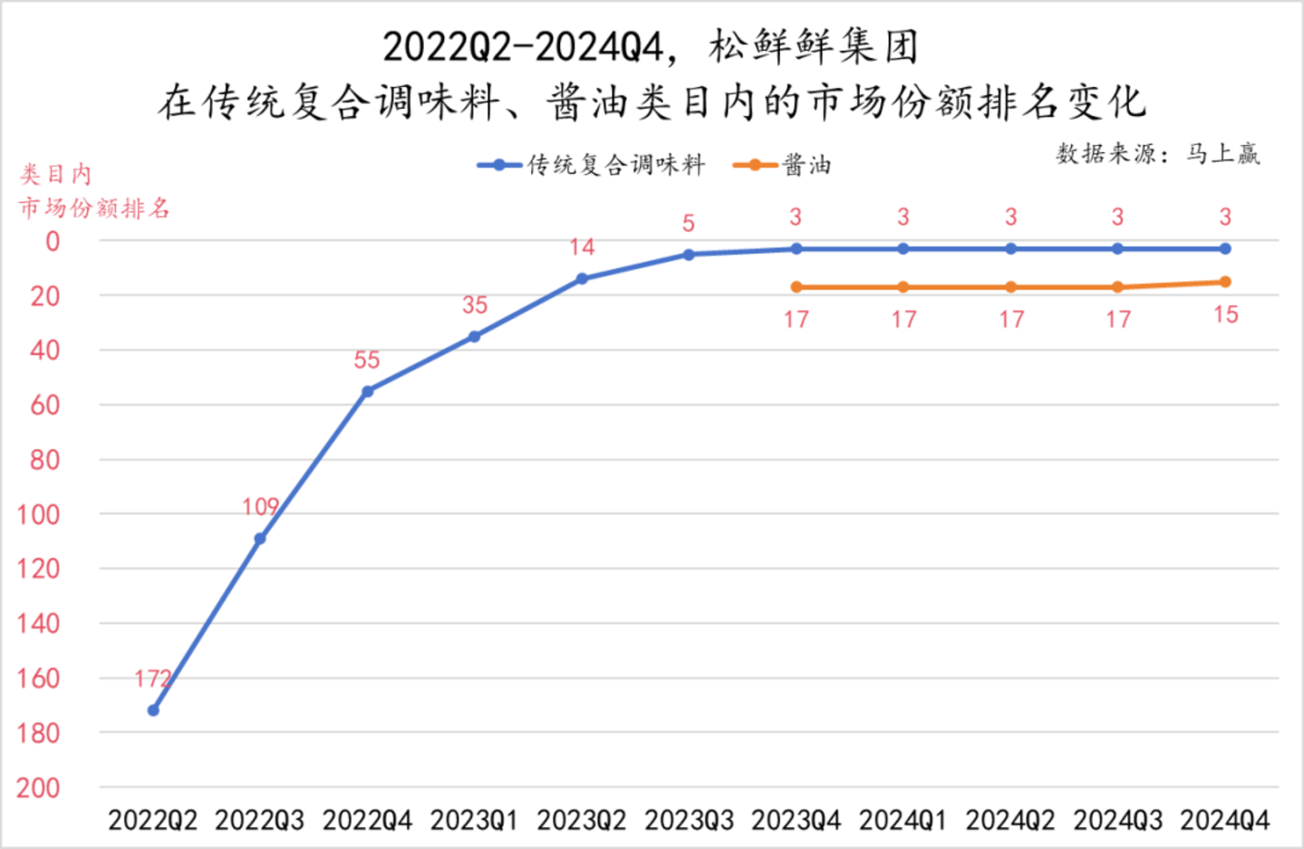 从类目内的集团市场份额排名上,也能清晰的看到松鲜鲜的“起飞”。自2022Q2起,松鲜鲜在传统复合调味料类目内的市场份额排名开始快速爬升,至2023Q4,已经稳定在第三位。