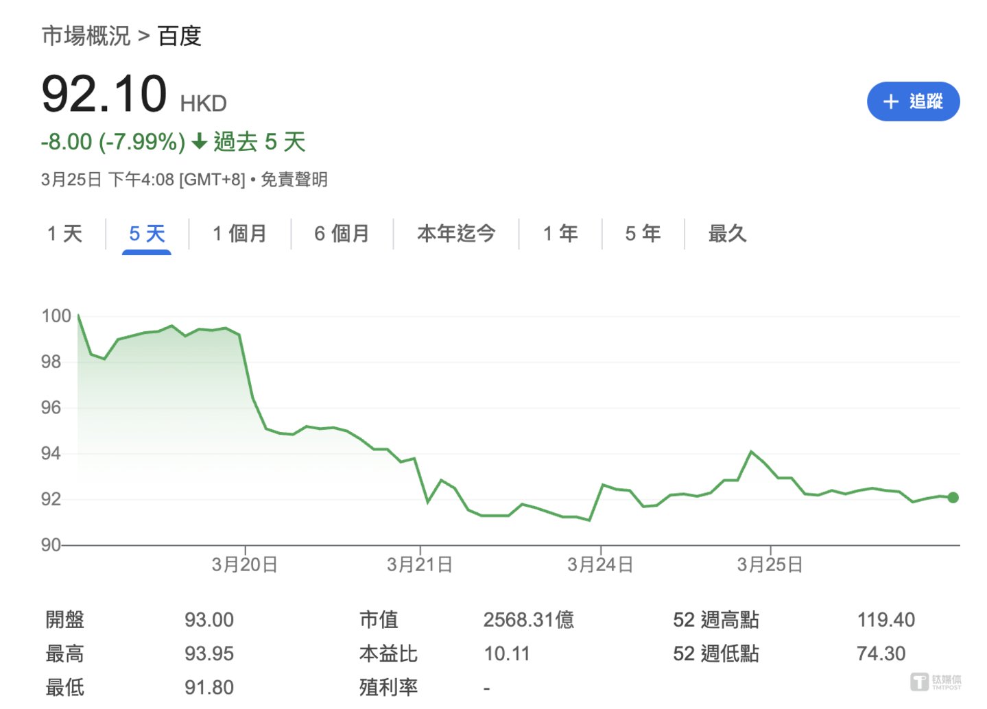 受“谢广军事件”和恒生指数持续下跌等多个因素影响,3月25日收盘,百度港股(9988.HK)股价下跌1.55%。过去一周内,百度港股累计跌幅近8%;百度美股(NASDAQ: BIDU)累计跌幅7.87%。