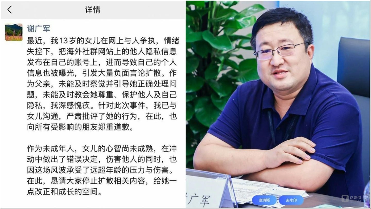 3月17日,谢广军发微信朋友圈确认此事,并表示他的13岁女儿在网上与人争执,情绪失控下,把海外社群网站上的他人隐私信息,发布在自己的账号上,进而导致自己的个人信息也被曝光。