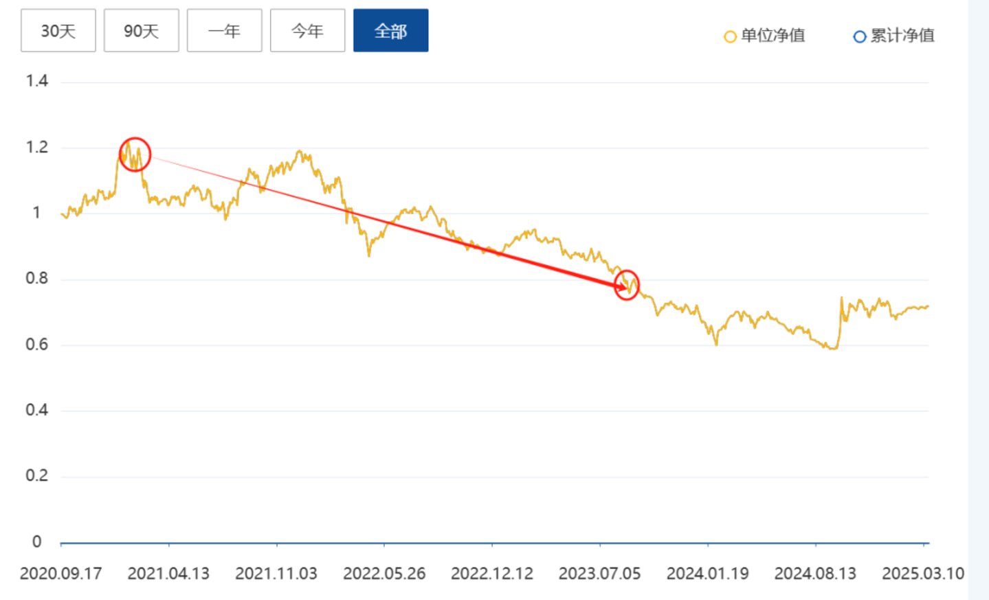 该基金曾在2021年2月时净值达到1.2,这也是刘建义入职华泰资管的时间。后续该基金净值虽有反复,但整体一直处于下行趋势。截至2025年3月24日,该基金的净值仅为0.7098。