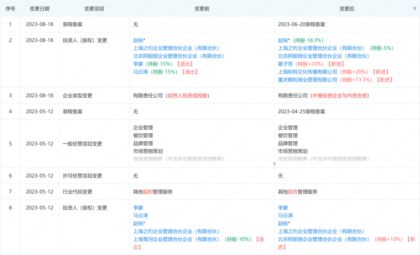 根据企查查信息显示,2023年5月大祥哥的北京阿妮娅企业管理合伙企业成为了上海立兆满企业管理有限公司的股东,持股10%。三个月后,公司的两位股东李某和马某退出,公司引入了三位新股东,直接拿走了公司53.3%的股份,赵某本人也有一定程度的稀释。股权变更带有一定的滞后性,所以情况基本与大祥哥所述一致。