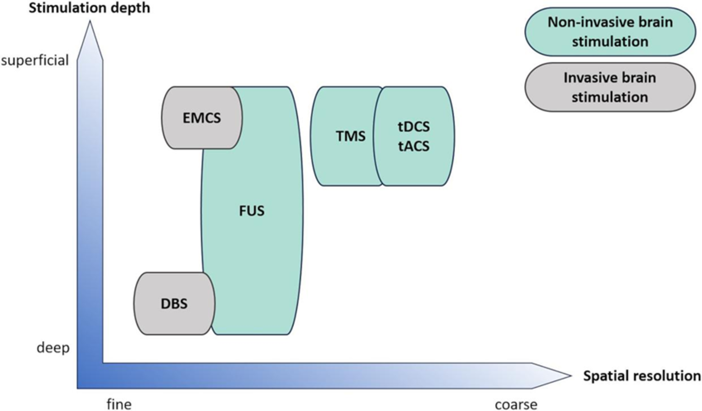 ▷几种神经调控技术的比较:FUS相较于其他技术,刺激范围更广。空间分辨率较高。来源:Matt, Eva, et al. "Current state of clinical ultrasound neuromodulation." Frontiers in Neuroscience 18 (2024): 1420255