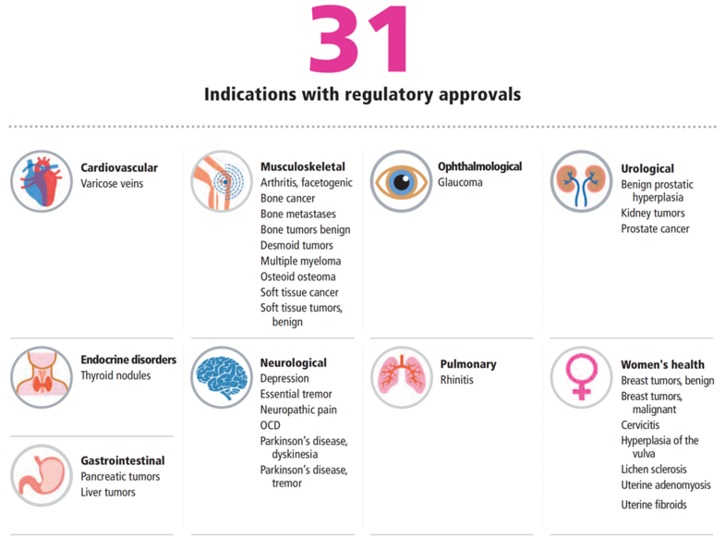 根据聚焦超声基金会《聚焦超声2024年度报告》,全球各国的监管机构共批准了32项FUS治疗方案,使该技术累计获批适应症达到31种,覆盖肿瘤、神经系统疾病等多个领域。