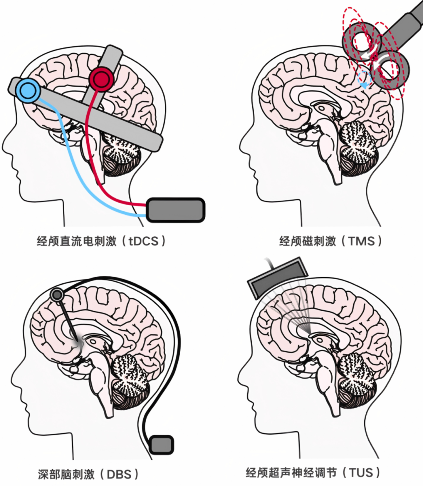 ▷当前四种神经调控方法,包括经颅直流电流刺激(TDC)、经颅磁刺激(TMS)、深部脑刺激(DBS)和经颅超声神经调节(TUS)。TDC和TMS明显限于表面目标,精度有限;DBS可以到达深脑站点,但具有侵入性。图源:Pellow C, Pichardo S, Pike GB. A systematic review of preclinical and clinical transcranial ultrasound neuromodulation and opportunities for functional connectomics. Brain Stimul. 2024;17(4):734-751.