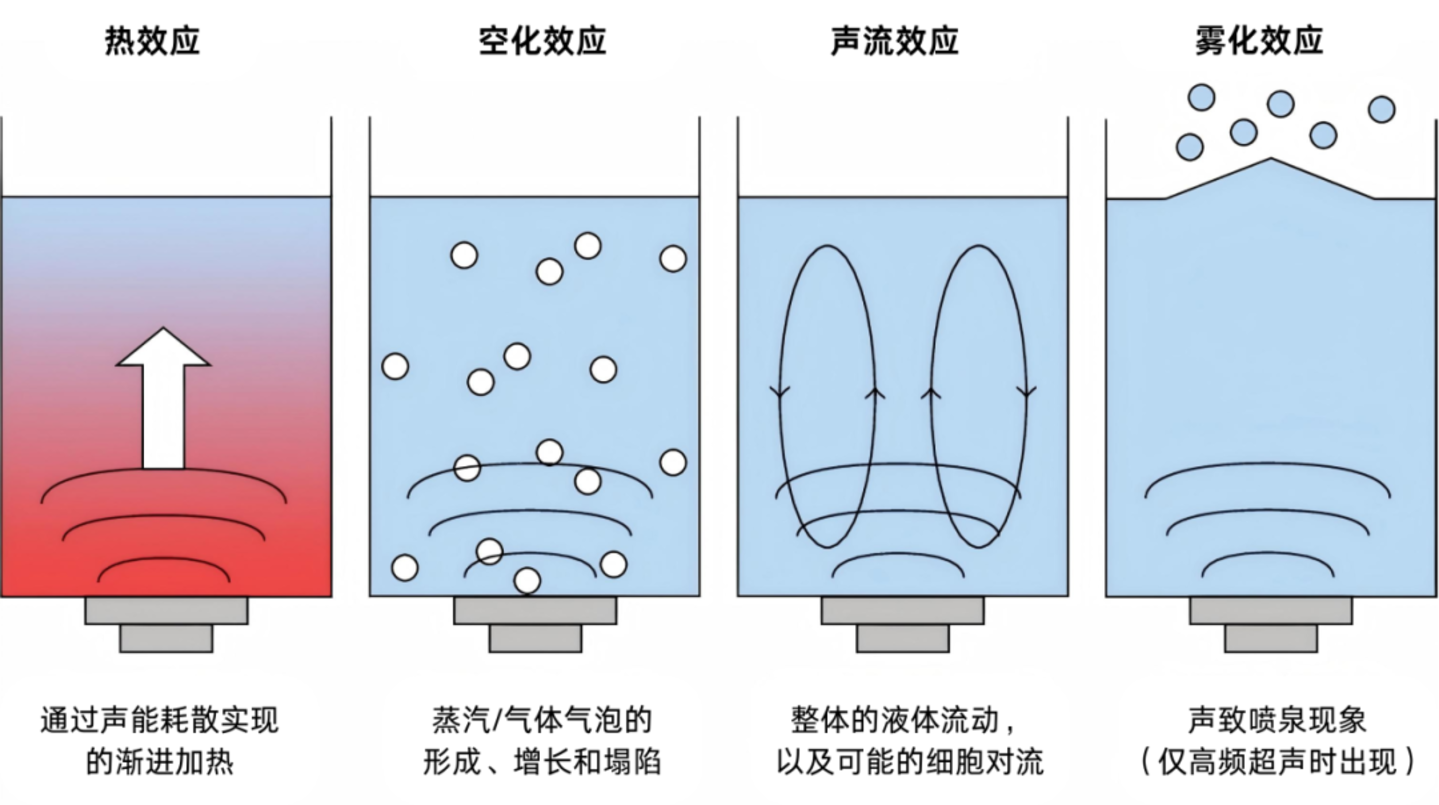当超声波强度足够高时,会导致微气泡在声波作用下不断生长、振荡(稳定空化)甚至剧烈坍塌(惯性空化)。这种效应发受声波频率、温度和压力的影响,并需要存在微气泡核作为起点,HIFU产生的热效应释放气体也是微气泡核的主要来源。空化还可能影响细胞膜电位,引起局部微流动。