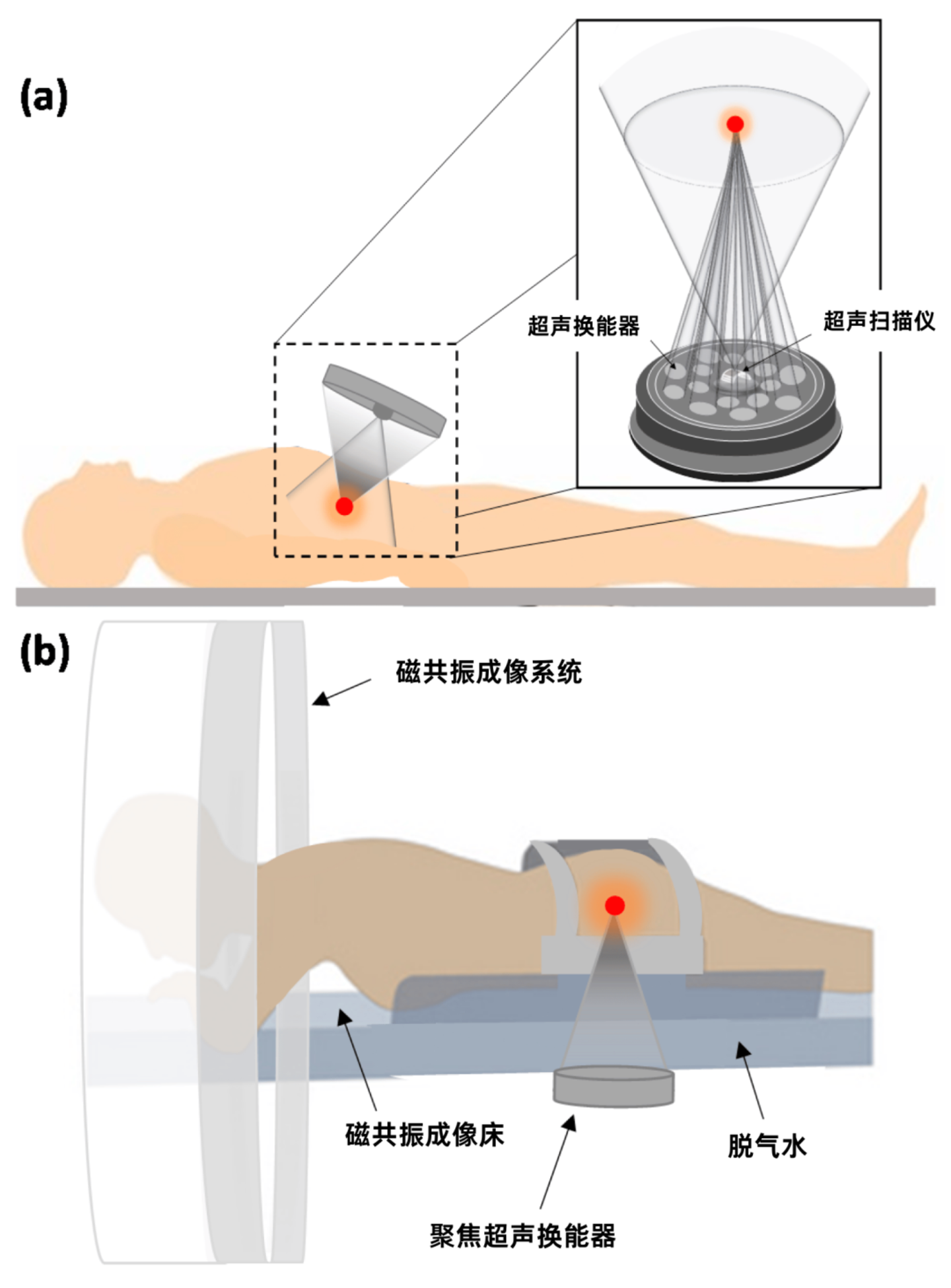 ▷(a)体外高强度聚焦超声(HIFU)换能器的结构示意图,包括成像和治疗探头,描述了一种针对患者的超声引导技术,以及(b)磁共振引导的体外聚焦超声系统治疗技术。图源:Izadifar Z, Izadifar Z, Chapman D, Babyn P. An Introduction to High Intensity Focused Ultrasound: Systematic Review on Principles, Devices, and Clinical Applications. Journal of Clinical Medicine. 2020; 9(2):460. https://doi.org/10.3390/jcm9020460