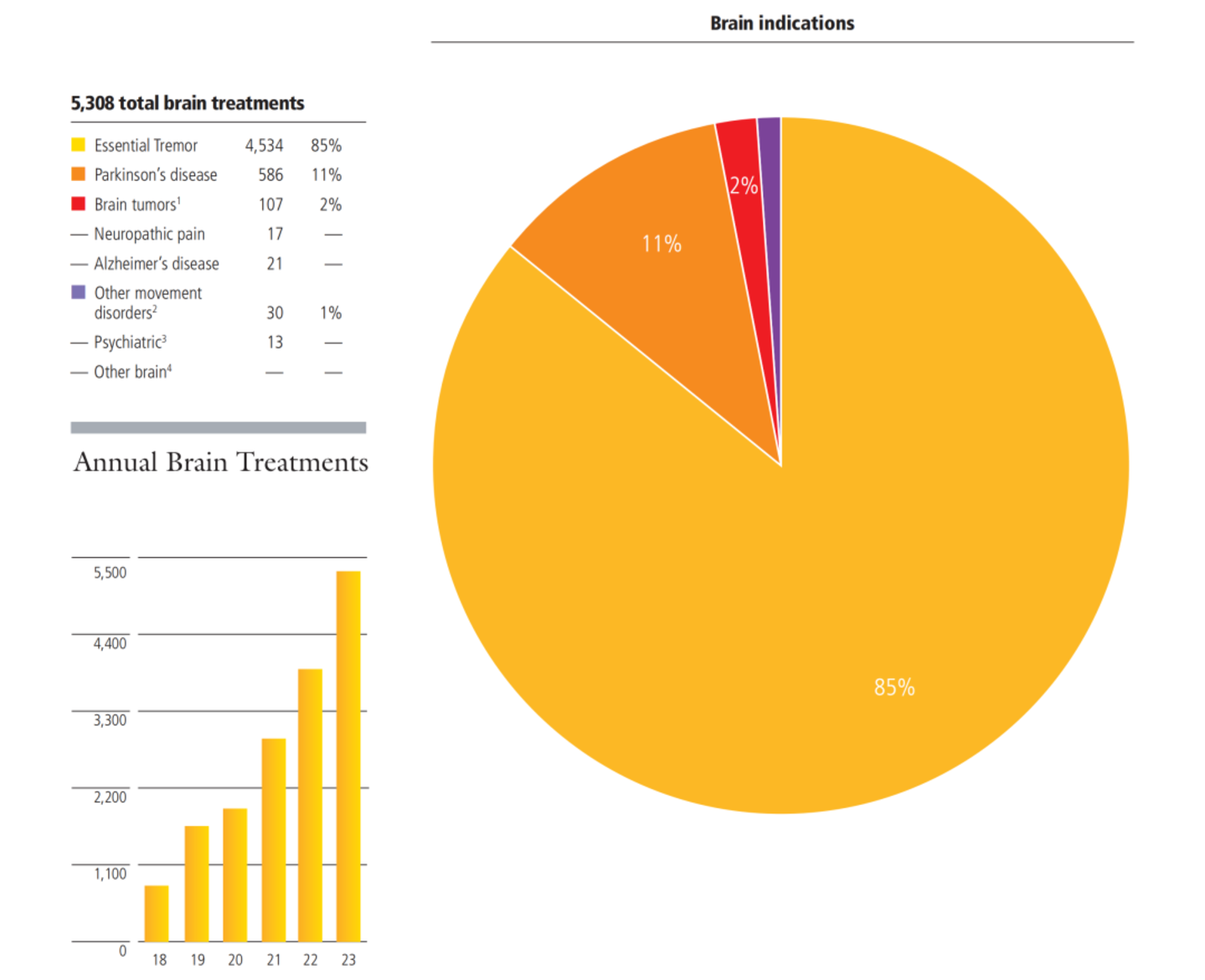 在脑部疾病中,FUS的应用呈现出令人瞩目的发展态势。2023年,FUS累计用于治疗脑疾病达17648次。虽然脑疾病在整体FUS医疗版图中占比尚小,但年度治疗量突破5000次大关,较上年劲增35%的亮眼增速,凸显该领域正成为医疗创新的重要突破方向。