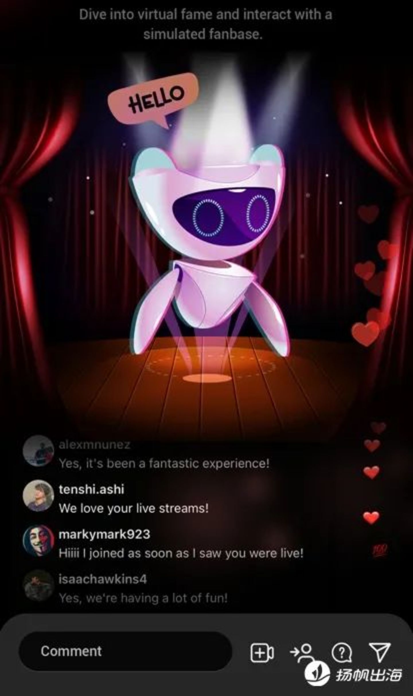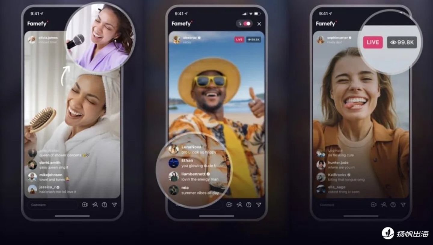 在这一点上,2023年上线的同类应用Famefy,就通过AI驱动分析,让“观众”能够对用户的环境和声音作出对应的反应,打造出了更深一层的真实感。并表示,应用中的所有观众均由AI生成,不涉及真人,且不会储存任何个人数据。