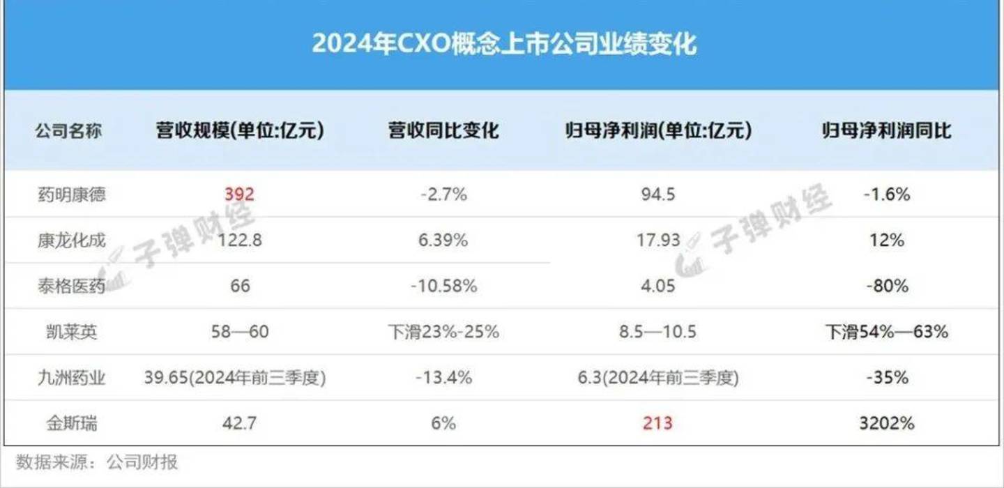 A股前五名CXO企业中,除康龙化成外,药明康德、泰格医药、凯莱英均有不同程度的下滑。九州药业还未披露2024年业绩预告,但从前三季度来看,公司业绩也出现了下滑。