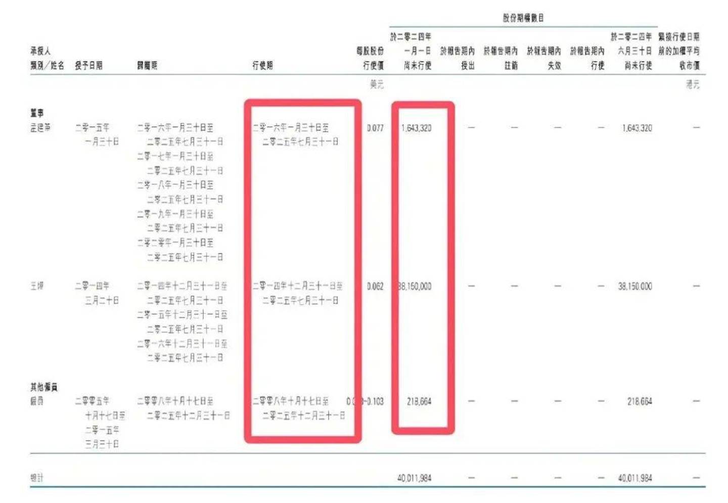 另外,执行董事孟建革也有部分期权需在2025年7月31日前行权,数量为164.332万股,行权价为0.597港元。其他雇员涉及上市前计划的未行权股份约21.8664万股,到期日为2025年12月31日。