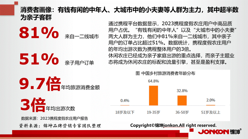 尽管当前乡村旅游产品存在一定程度的同质化,但乡村旅游结合乡愁文化、精致民宿和红色旅游等特色旅游正逐渐成为新趋势。从乡村旅游的消费者人群画像显示,19-35岁的年轻群体、女性消费者和亲子客群是主力军,他们通常为企业职员,具有中等收入水平。