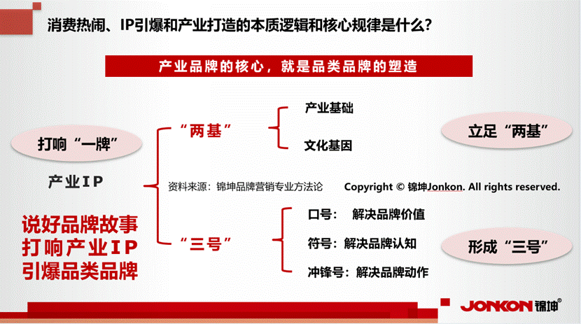 作为全国知名的产城园企品牌服务商锦坤创始人,石章强认为,品牌的打造本质上在于通过“产城园企”的发展逻辑,将产业、城市、园区和企业“品牌化”,通过品牌顶层设计的引领作用,让产城园企形成一体化的消费热闹、IP引爆和产业打造,通过找到品牌的文化基因和产业基础(两基)、形成品牌的口号、符号、冲锋号(三号),从而塑造核心品牌(一牌)。