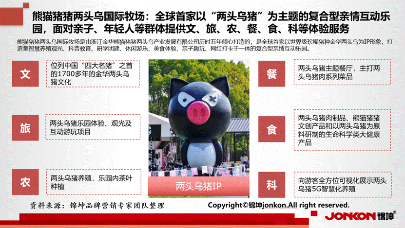 熊猫猪猪国际牧场以金华两头乌猪为主题,打造了独特的品牌形象,并通过金华两头乌猪的地理标志认证,加强品牌建设,提升产品知名度和影响力。