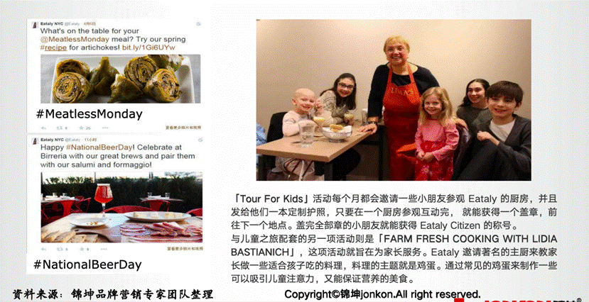社交媒体除了是Eataly品牌理念展示的窗口,还是Eataly与消费者沟通的桥梁。Eataly利用社交媒体邀请消费者参与烹饪课程和品尝活动,如“TourForKids”(儿童之旅)和“FARMFRESHCOOKINGWITHLIDIABASTIANICH”等。通过与消费者面对面,增加了消费者对品牌的认知,也提升了品牌的亲和力和顾客忠诚度。
