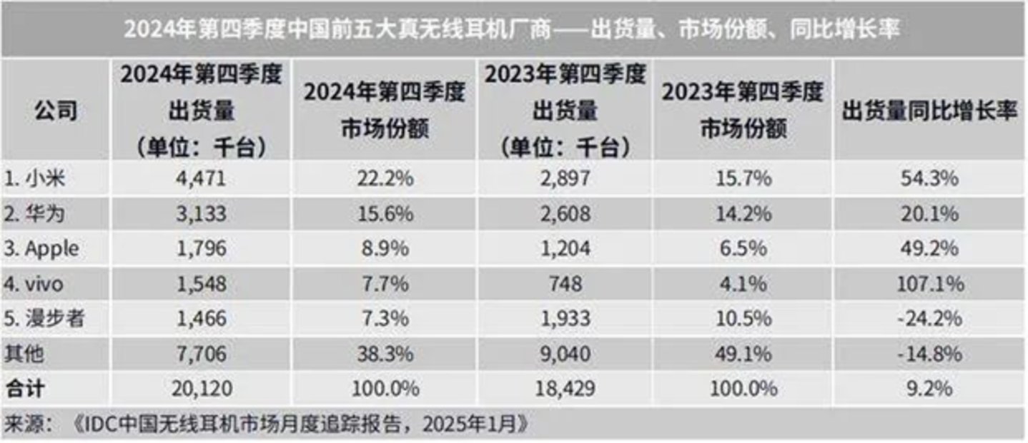 这意味着尽管漫步者近年持续加码OWS+AI耳机,全面布局了耳挂式、后挂式、耳夹式各产品形态,并且已上市型号11款,但其打造的“第二曲线”拉动作用尚未显现。除了在新兴市场的渗透受阻,漫步者在国内TWS出货量亦同比下降24.2%,在头部厂商中垫底(据IDC数据)。
