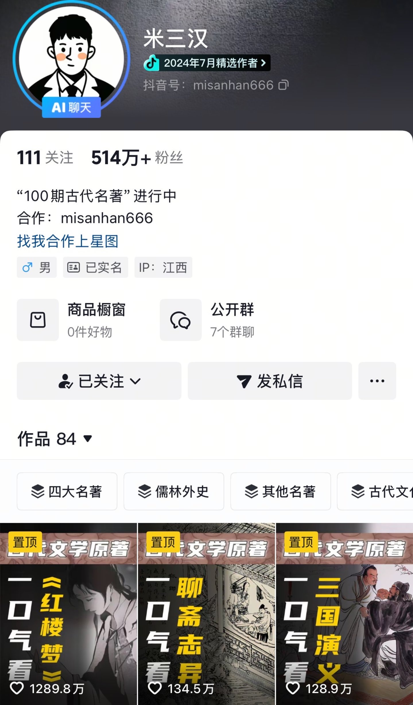 米三汉在尝试过AI后,也有了类似感受。作为2024上半年“抖音涨粉最快”的作者之一,他凭借450分钟深度讲解《红楼梦》的超长视频,在抖音收获超过1200万的点赞量、超过3亿的浏览量。然而,在米三汉分享的超长视频创作中,他对AI的使用量是“零”。