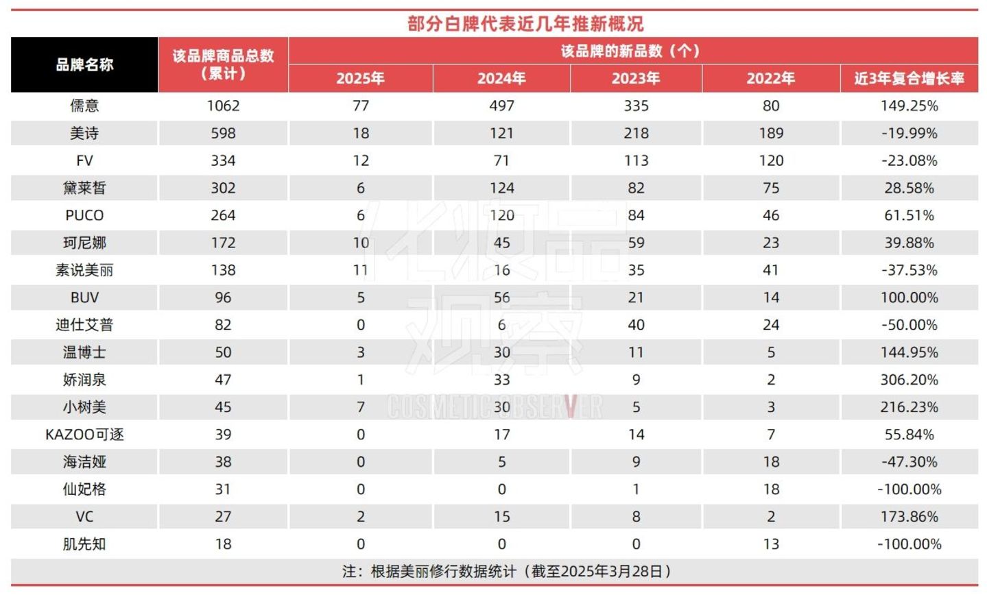 一定程度上,新品数折射出白牌的市场沉浮。本文基于美丽修行独家数据,梳理出一些热门白牌的新品备案情况,以解析白牌的推新密码。