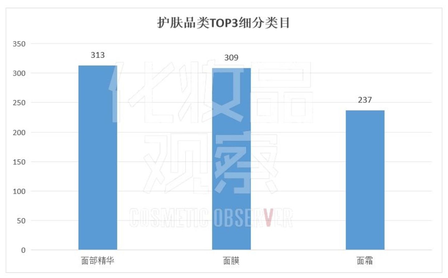 从品类来看,白牌青睐的护肤品类前三细分类目分别为面部精华、面膜、面霜,相关产品共计313个、309个以及237个;彩妆品类中备案数位居前三的分别为底妆、唇妆、眼妆,相关产品数分别为229个、192个、130个。