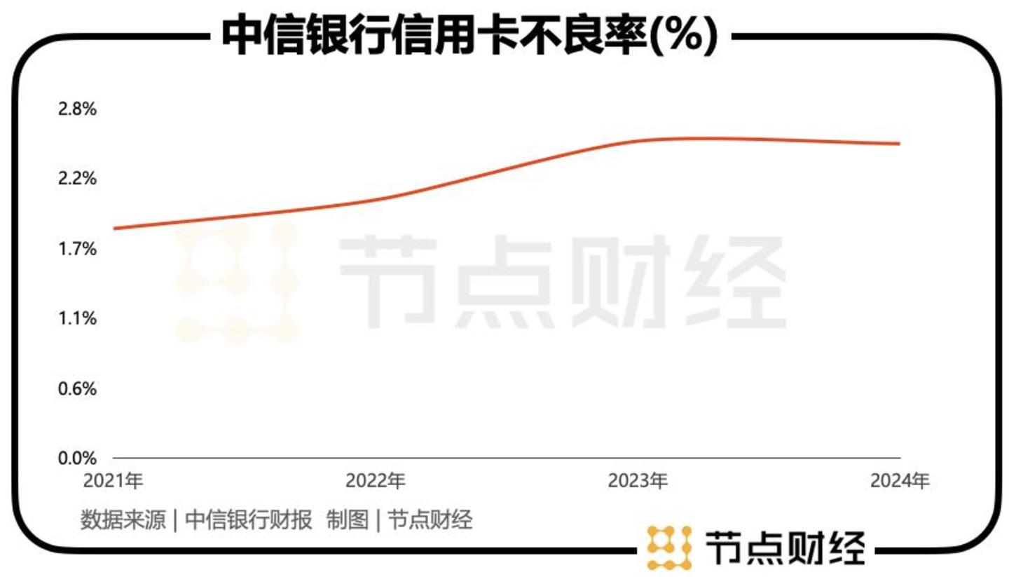 回溯既往,前几年中信银行为了扩大零售规模,在一定程度上放松了信用卡、消费贷的审批。结果自2021年以来,信用卡不良率一路上扬。