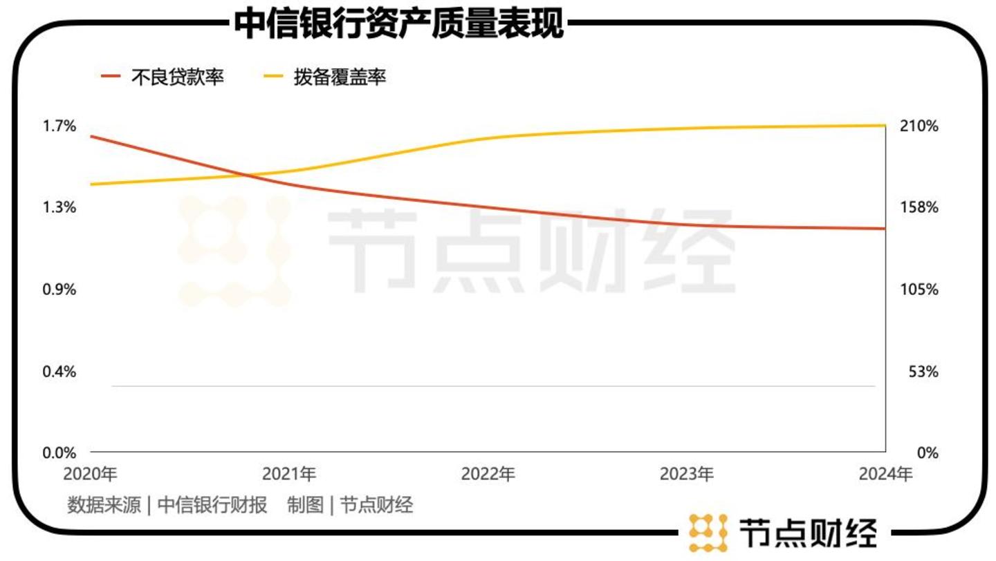财报显示,截至2024年末,中信银行不良贷款余额664.85亿元,比上年末增加16.85亿元,增幅2.60%;不良贷款率1.16%,比上年末下降0.02个百分点;拨备覆盖率209.43%,比上年末上升1.84个百分点。