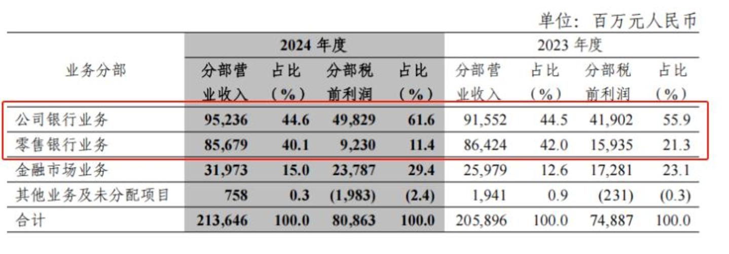 更不容忽视的是,零售业务的税前利润大幅下挫42.08%。回拨时间轴,从2021年到2024年,中信银行零售业务的税前利润从227亿元降至159.35亿元,并进一步降至92.3亿元,贡献占比也从34.7%到21.3%,再到11.4%,步步退守。