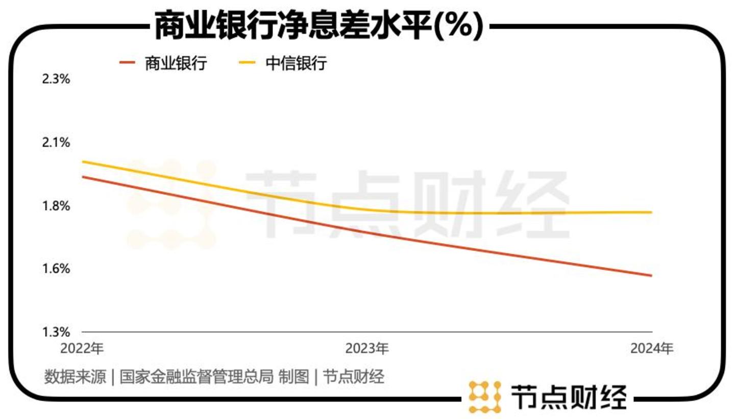 根据监管披露的数据,2024年第四季度,商业银行净息差为1.52%,环比减少0.01个百分点,同比减少0.16个百分点。拉长视线,2022年—2024年,商业银行的净息差萎缩了0.45个百分点。