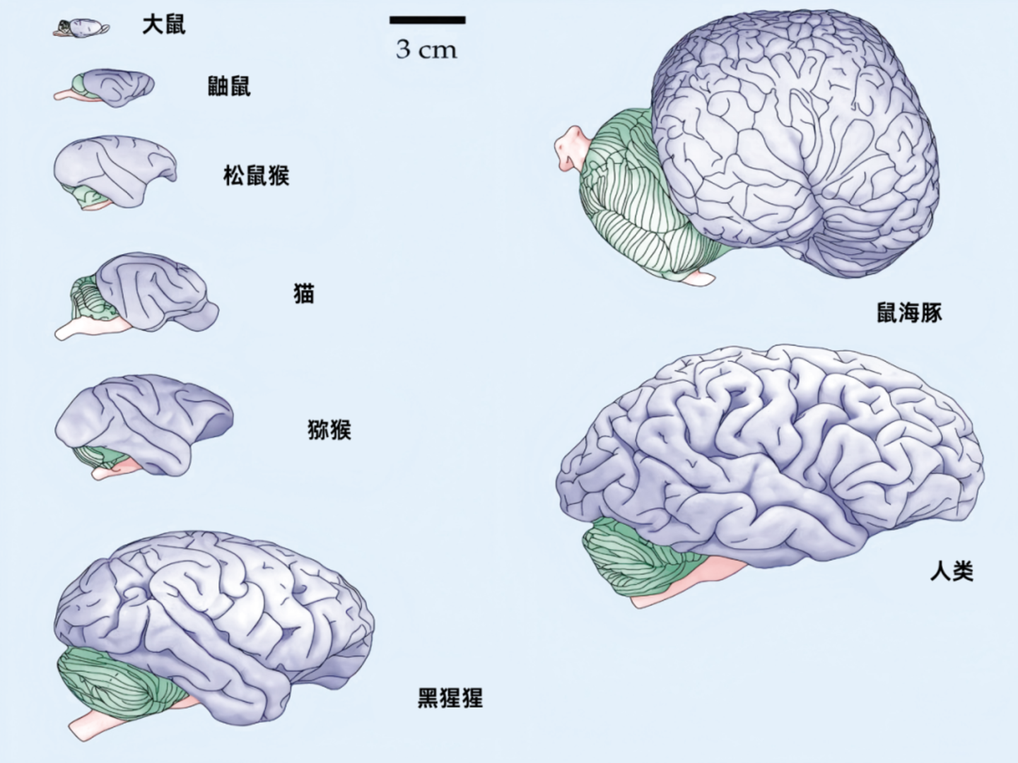 对人类小脑的深入认知,将修正关于脑演化与发育的经典理论框架。与其他灵长类动物相比,人类小脑体积比预期值大出2.9倍[5]。且在猿类与人类进化谱系中,其扩张速率远超新皮层[6]。现代人类小脑与大脑皮层的体积比例较类人猿显著失衡,暗示其在认知飞跃中扮演特殊角色。