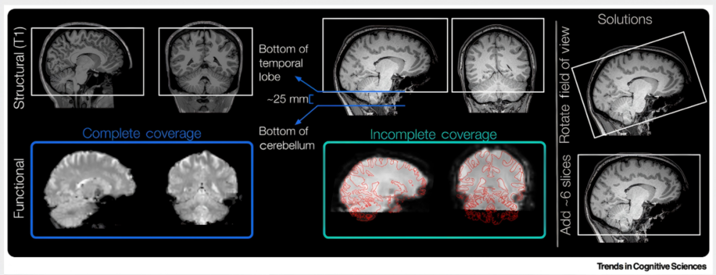▷功能性神经影像学研究中常见的小脑覆盖不完全现象。图中提供了两个公开数据集的例子,体现了完整和不完整的小脑覆盖情况,并强调通过调整数据采集参数可以避免小脑缺失,确保全脑成像的完整性。图源:[4]