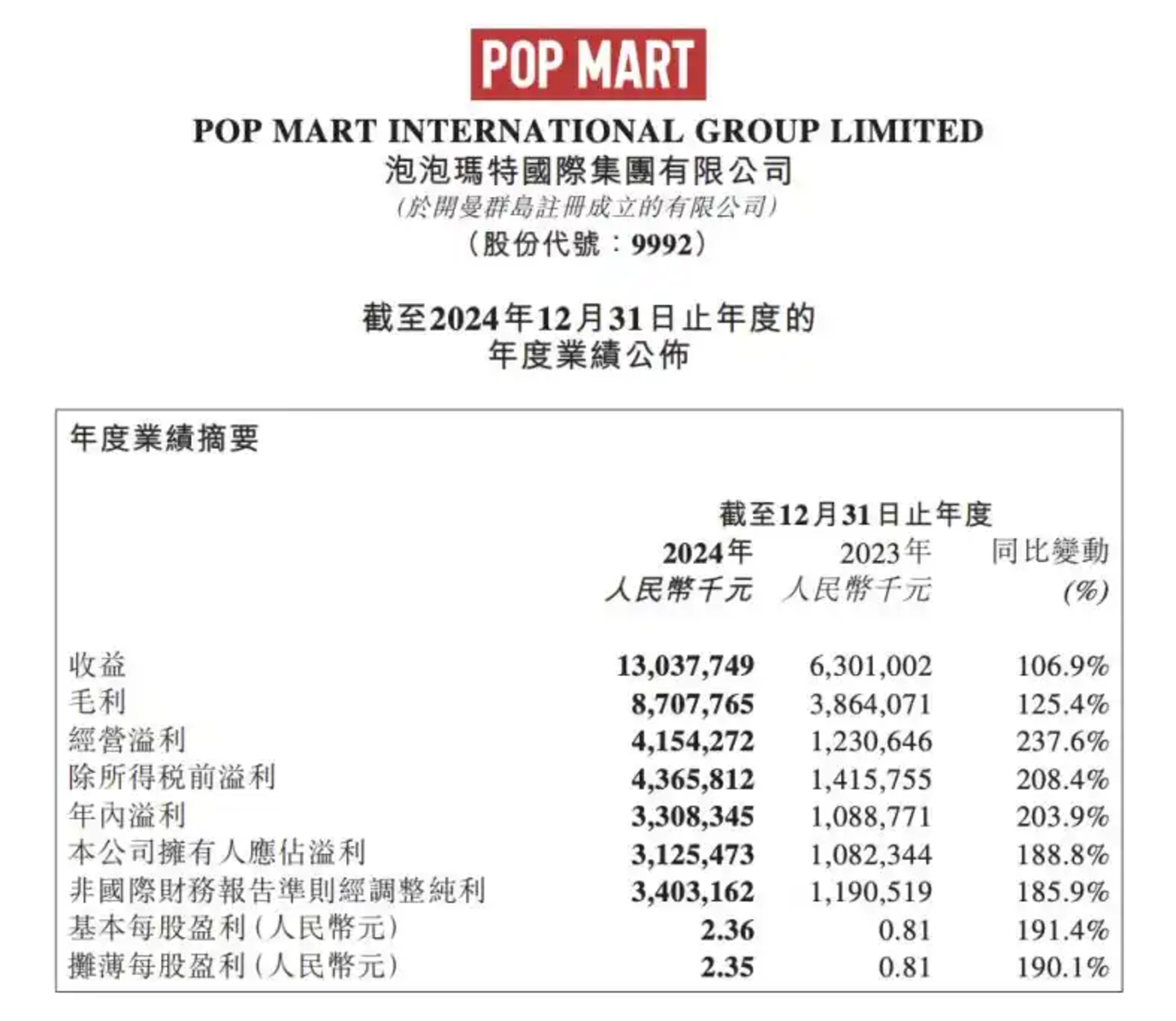 根据财报显示,2024年泡泡玛特实现营收130.4亿元同比增长106.9%,经调整净利润34.0亿元,同比增长185.9%,创下历史新高。