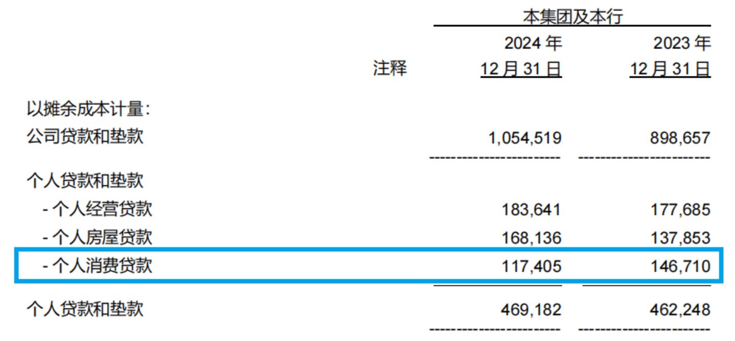 这种下降似乎来自2024年下半年。浙商银行在2024年上半年末的个人消费贷款余额为1369.82亿元,但是到了年末仅剩下1174.05亿元。