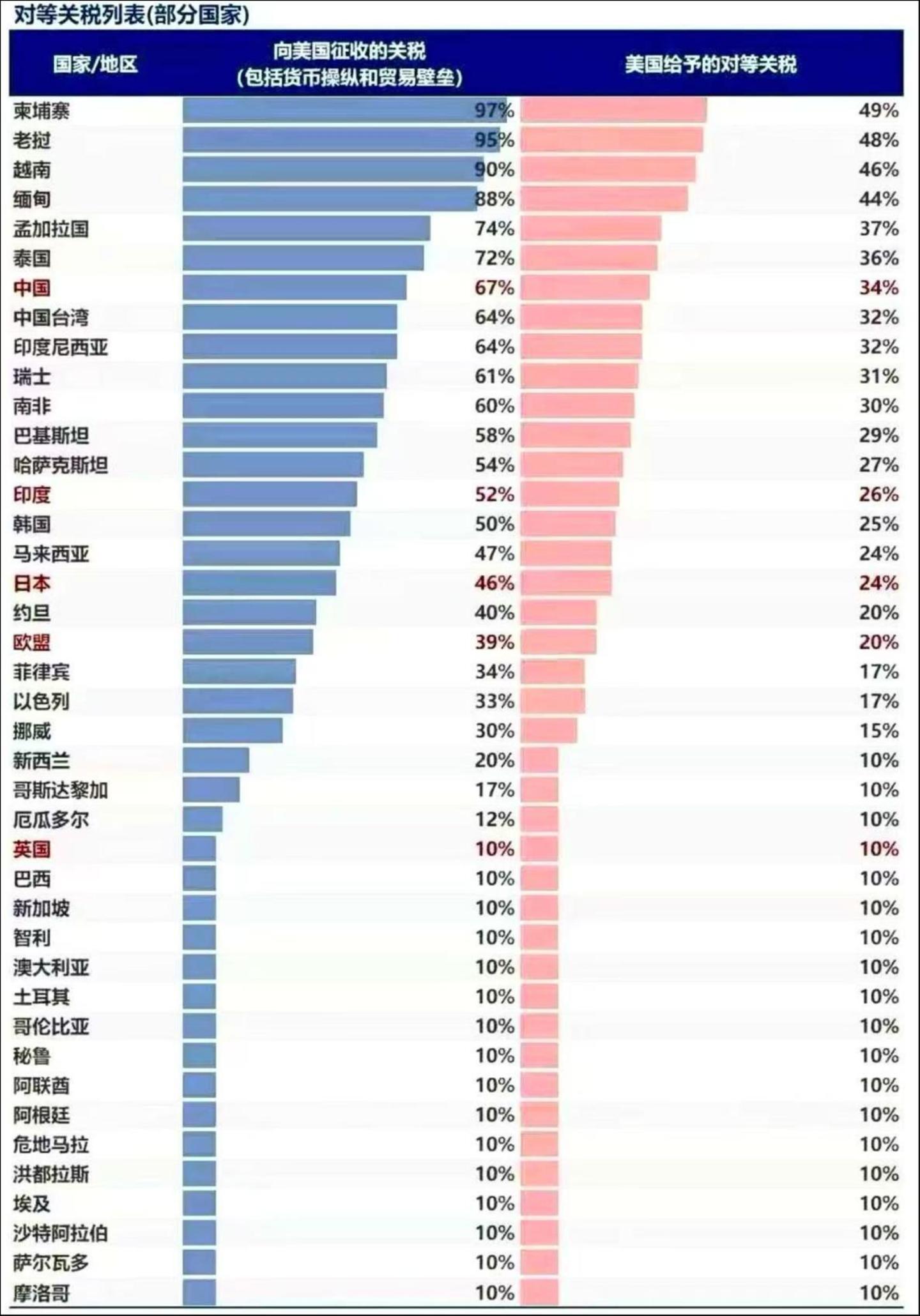 同时白宫表示,对等关税是在现有关税上的额外征收。那么,34%的对华对等关税将与原本的美国对华关税20%叠加,因此对中国征收的总关税税率将达54%。