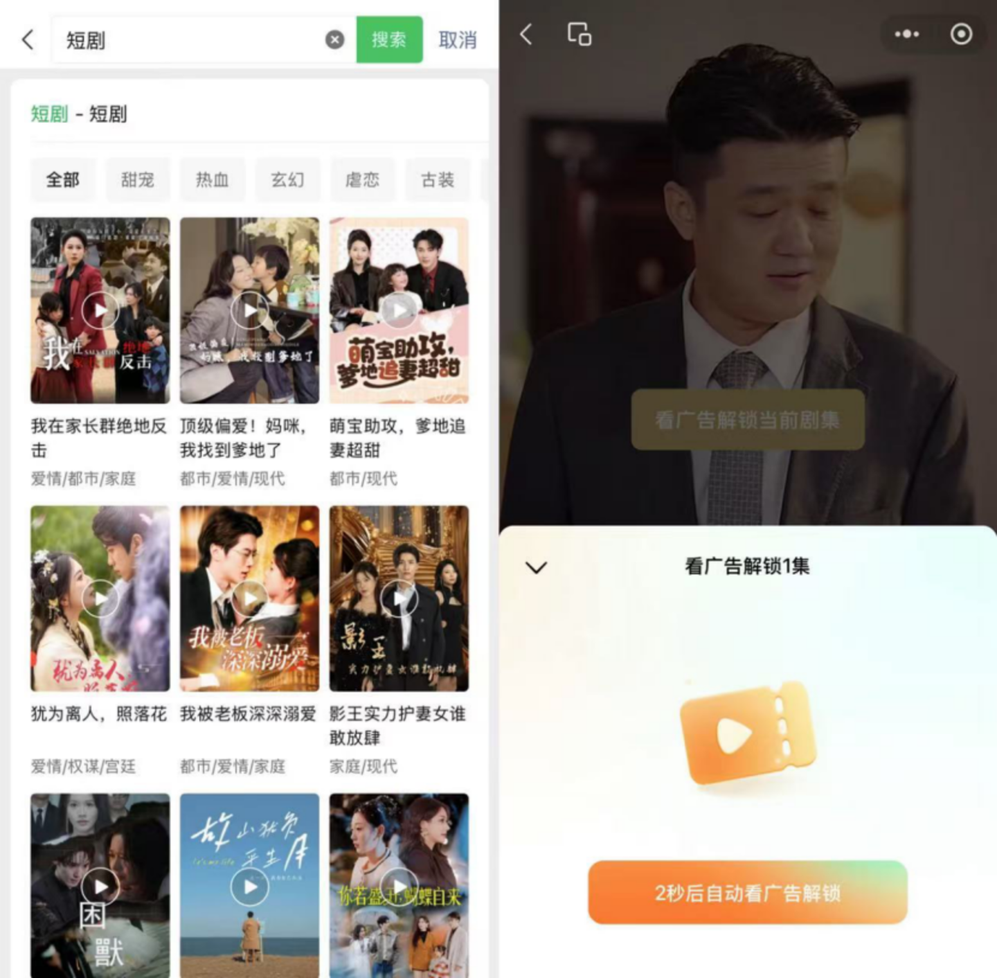 另一方面是视频号推广。去年上半年,视频号内测挂载短剧小程序,用户点击视频下方的短剧名称,则可直接跳转短剧小程序付费解锁。