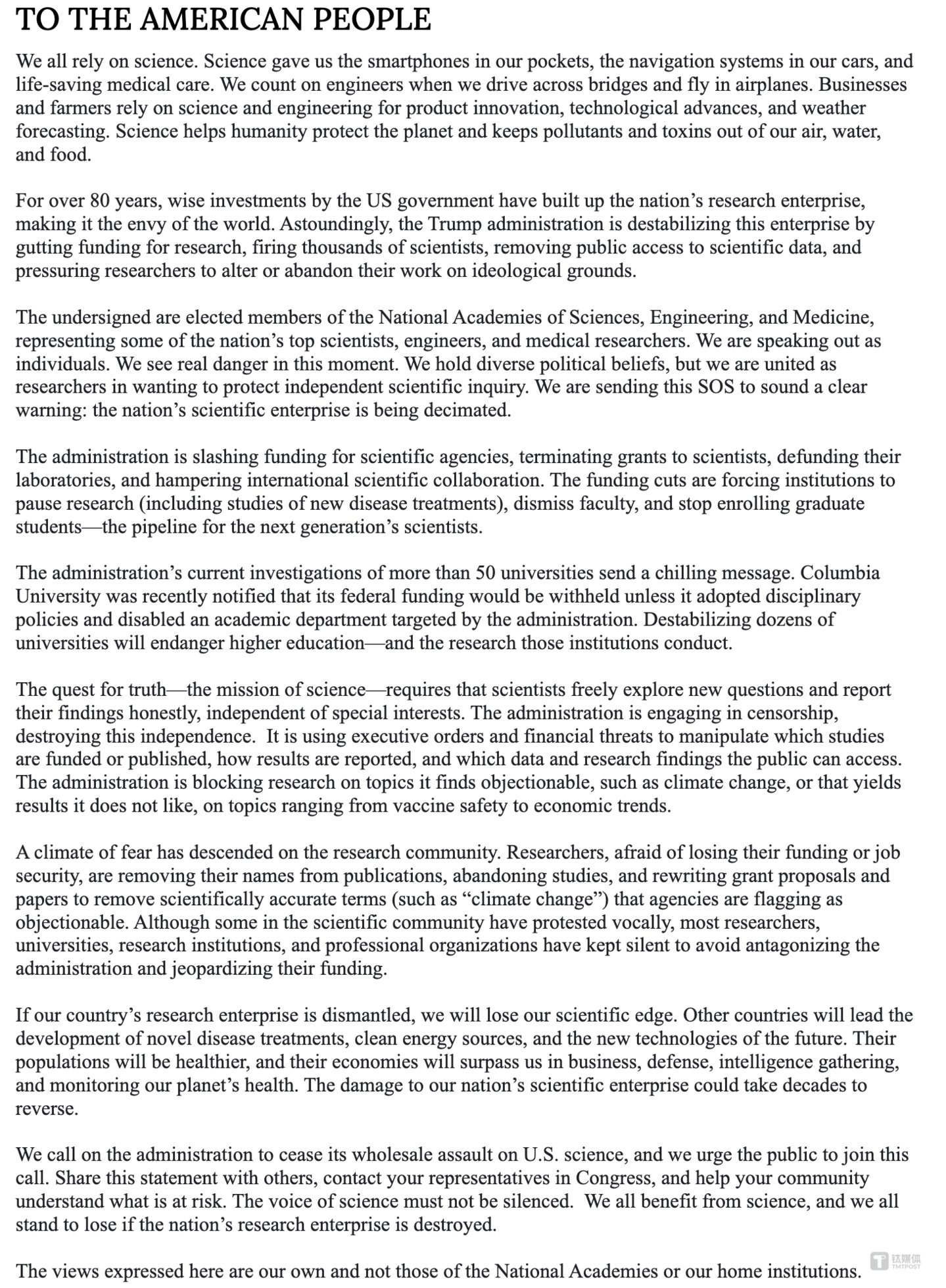 “恐惧的气氛笼罩着研究界。研究人员担心失去资金或工作保障,纷纷从出版物中删除自己的名字,放弃研究,重写拨款提案和论文。如果我们国家的研究事业被瓦解,我们将失去科学优势。其他国家将引领新型疾病治疗、清洁能源和未来新技术的发展,我们国家科学事业的损害可能需要几十年才能逆转。科学的声音绝不能被压制。我们都受益于科学,如果国家的研究事业被摧毁,我们都会蒙受损失。”信中表示。