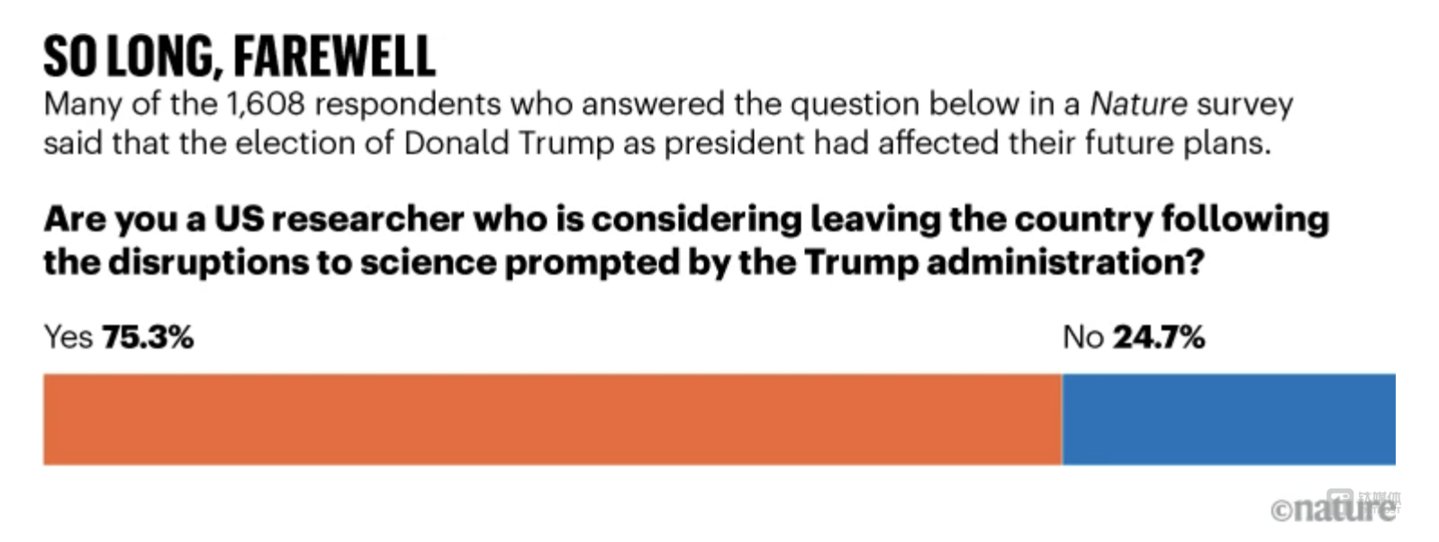 知名学术期刊《自然》杂志的最新调查显示,在1650名受访科学家中,有四分之三(75%)受访科学家(超过1200人)考虑离开美国,其中青年科研人员占比尤为突出。