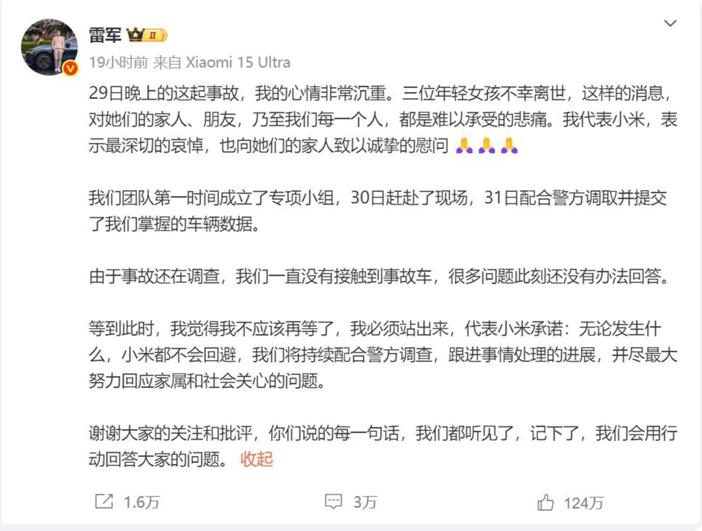 雷军沉痛发言,称29日晚事故令心情沉重,三位年轻女孩生命骤逝,深感哀伤。他代表小米公司向逝者致哀,向家人致以最诚挚慰问。
