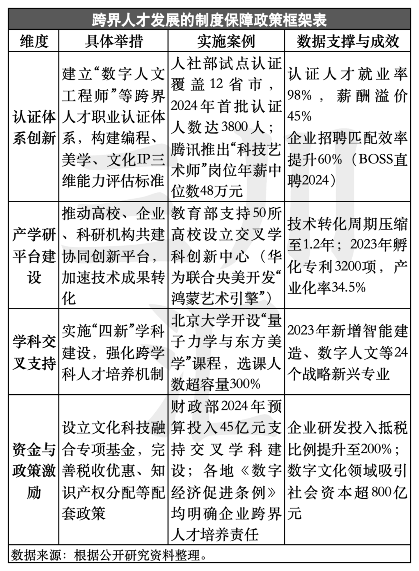 在政策层面,需通过制度创新为跨界人才进入文化产业提供更多机会和平台。设立跨界人才认证体系,如人社部试点的“数字人文工程师”认证,构建编程能力、美学素养、文化IP开发的三维评估体系。搭建产学研协同平台,推动高校、企业与科研机构的深度合作,加速技术成果转化。如教育部“新工科”建设规划提出,支持50所高校设立交叉学科创新中心,覆盖人工智能艺术、数字文化遗产等新兴领域。