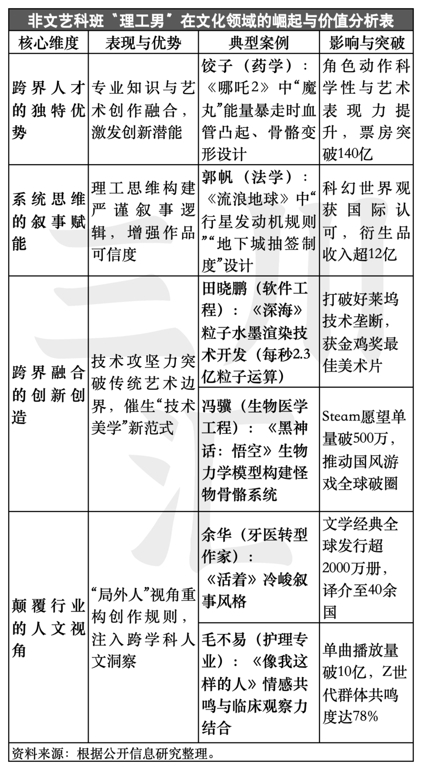 非文艺科班“理工男”的崛起,既是百年跨界传统的当代延伸,更是文化科技深度融合催生的产业进化,折射出跨界人才在文化科技领域中的独特优势、文化科技融合对多元化人才的需求以及跨界创新中的突破性作用,为培养兼具科技理性与人文情怀的复合型人才提供了典型样本。