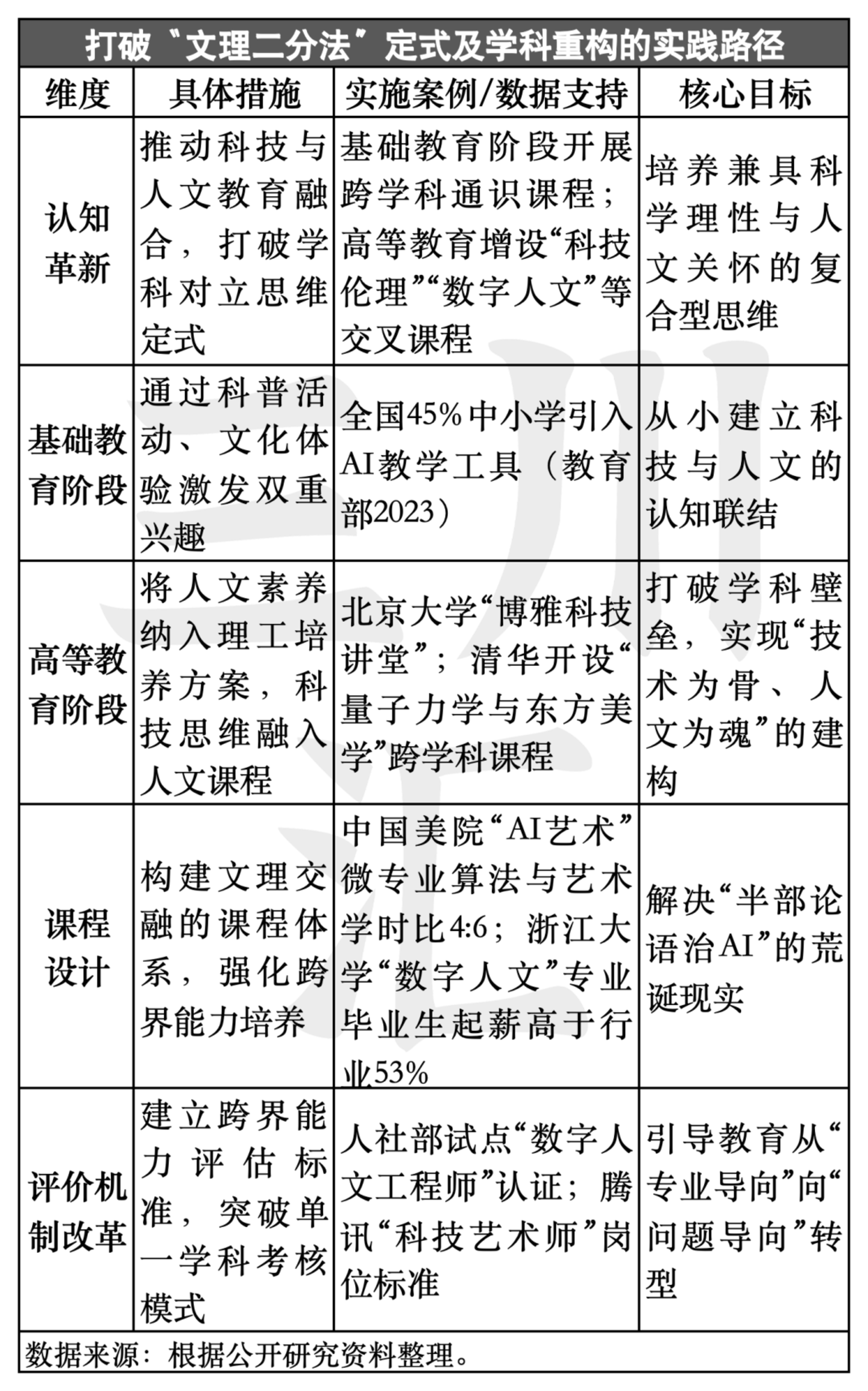 在培养层面,高校应充分发挥学科门类齐全的优势,科学整合多学科资源,对科技课程和人文课程进行深度整合与重构,推动形成由“单科专精”向“能力立方”转变。在理工科课程中增加“科学技术史”“科技伦理”等人文社科类课程,引导学生思考科技对社会、伦理和文化的影响。例如,中国美院“AI艺术”微专业,要求算法训练与艺术创作学时占比4:6;浙江大学开设“数字人文”微专业,要求学生完成至少2个跨学科项目。