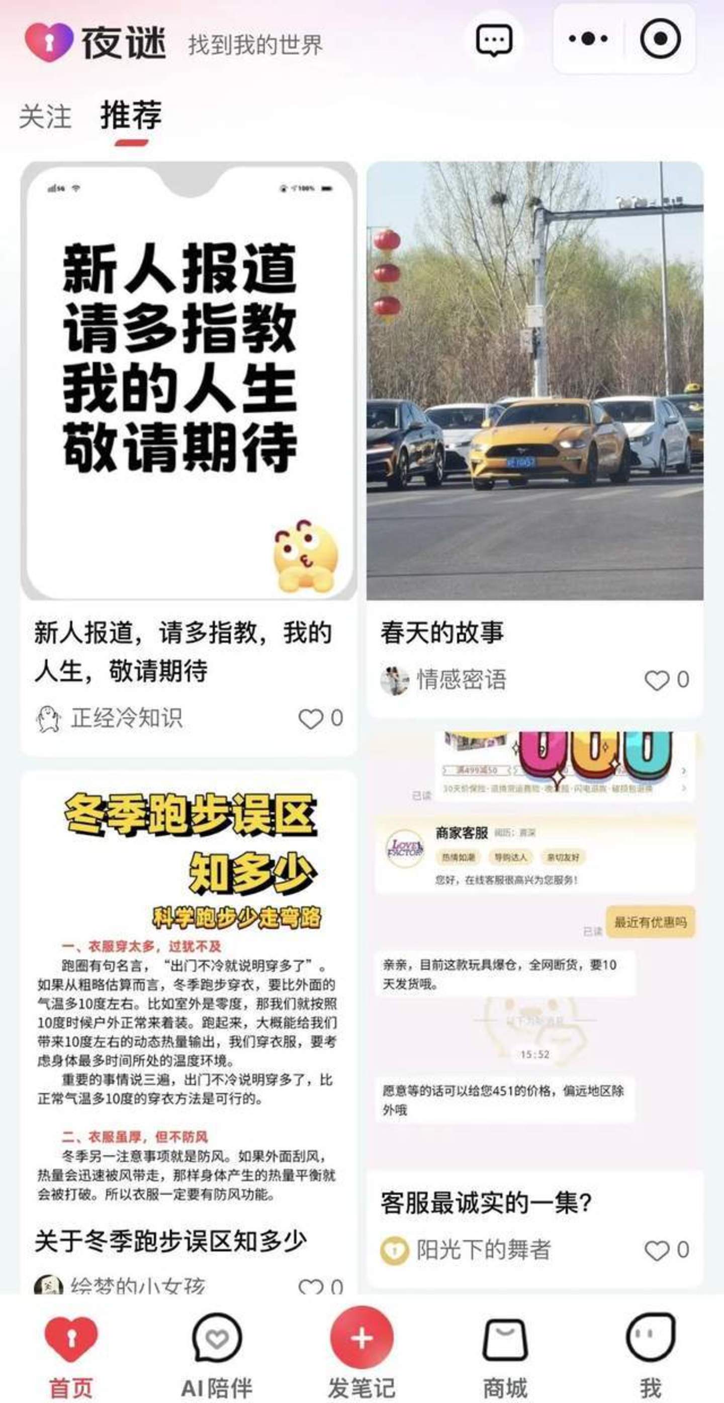 夜谜上线之初,引发了不少网友的声讨,被有些网友辣评为“擦边大合集”“浓眉大眼的京东也开始搞擦边”,甚至怀疑是京东出了Bug。“趣解商业”注意到,目前“夜谜”内已经没有原先的大尺度内容,调整为类似小红书的图文两性科普社区,同时添加了商城入口,和AI伴侣聊天的功能。