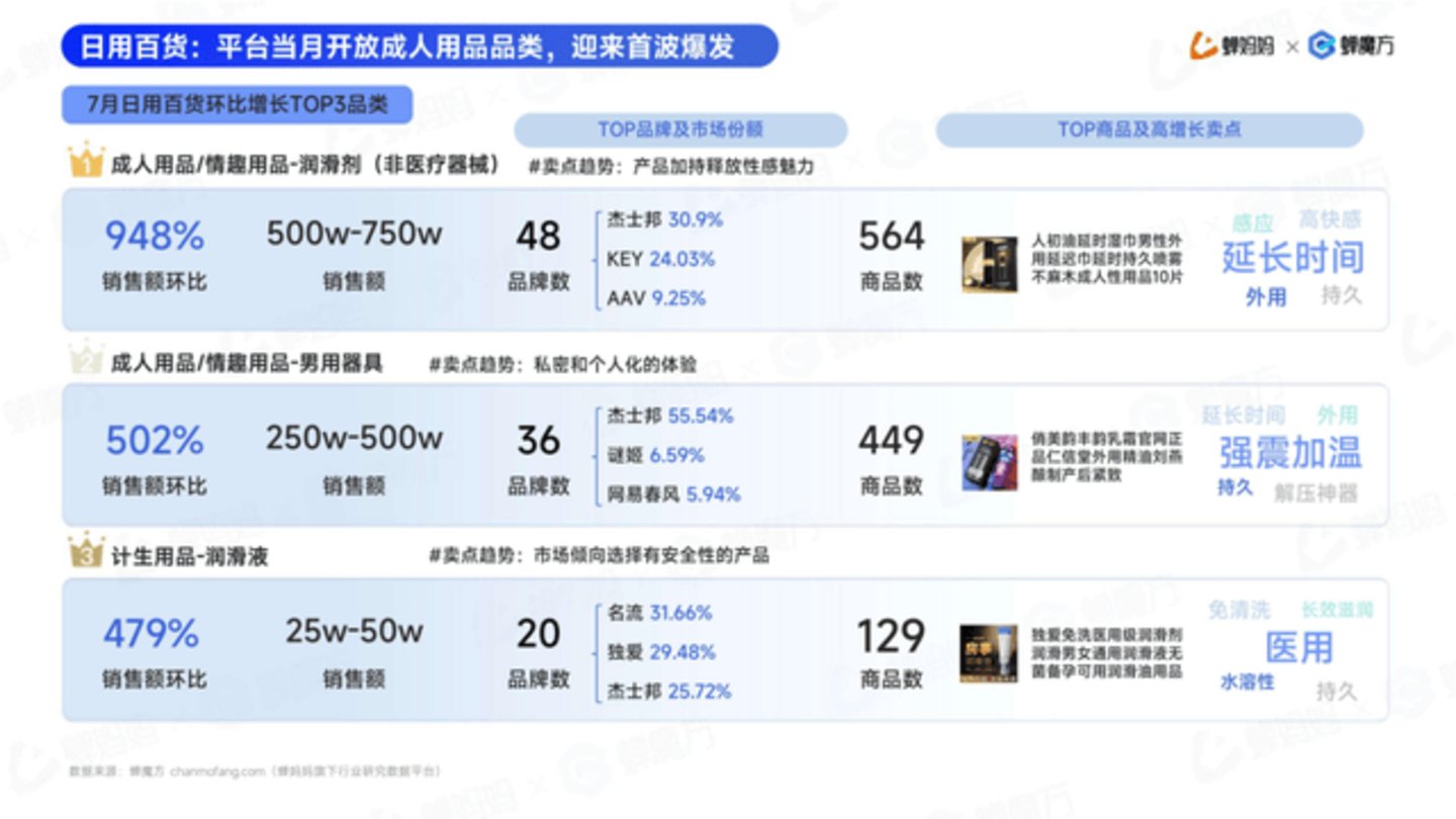 “蝉魔方”数据显示,2024年上半年,抖音平台成人用品/情趣用品类目销售额超过2500万元,增速超过1330%,远高于抖音电商整体增速。