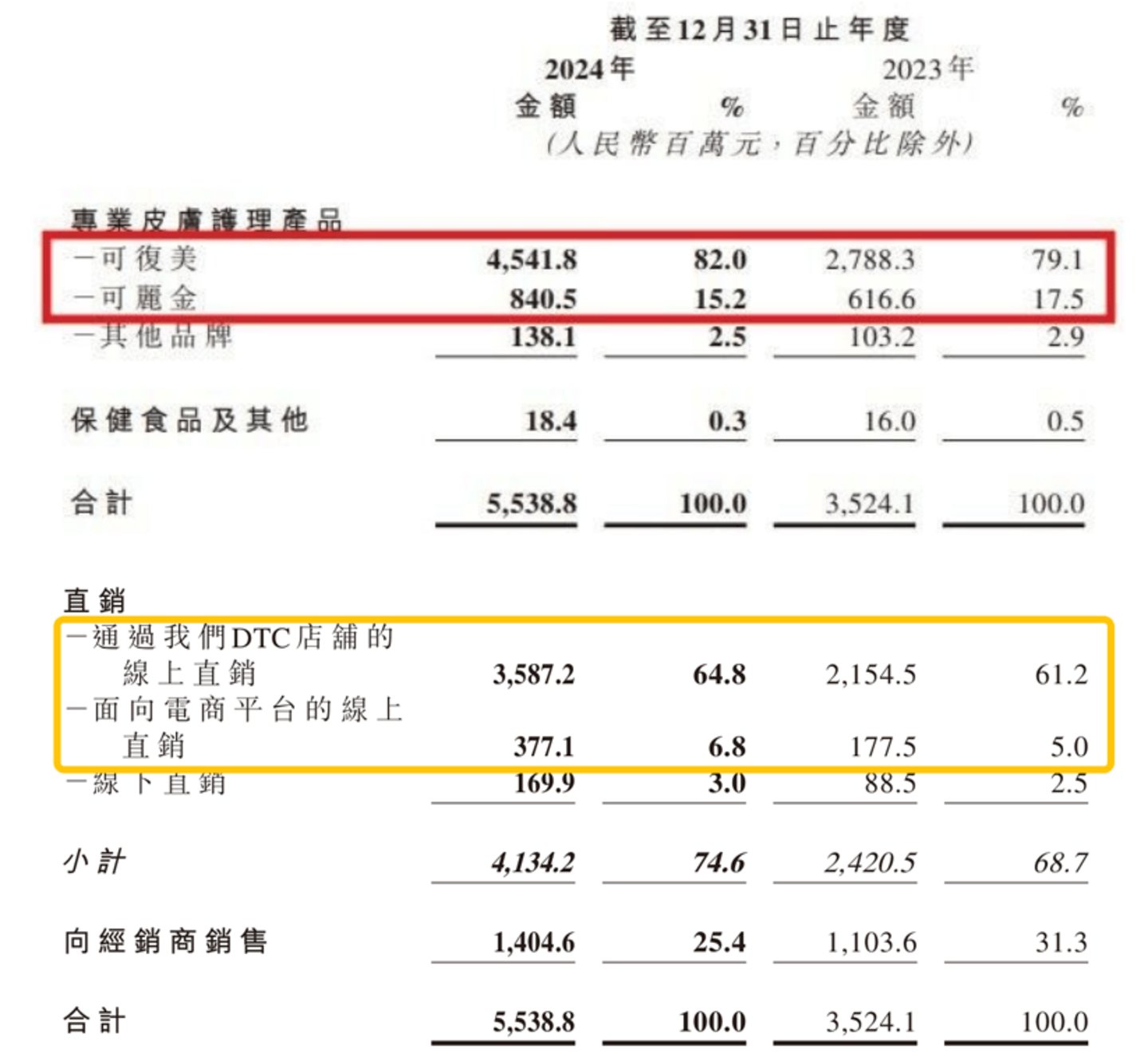 2024年,可复美收入破45亿元,向50亿规模前进,同比增长更是达到62.9%。同期,公司线上收入同比增长约70%至39.54亿元,占比71.6%,均远超过整体营收增速。