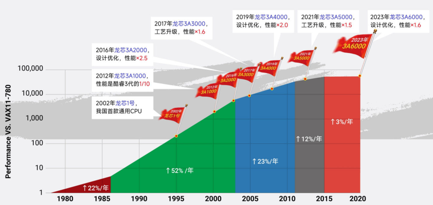 如今,龙芯的3A6000、3C6000、2K3000并称“三剑客”,1C0203、2K0300、2P0300并称“三尖兵”,均以颇具竞争力的性价比,广受市场好评。其中,2023年推出的龙芯3A6000,性能可以跟Intel的第10代酷睿相比,达到了国际主流水平。