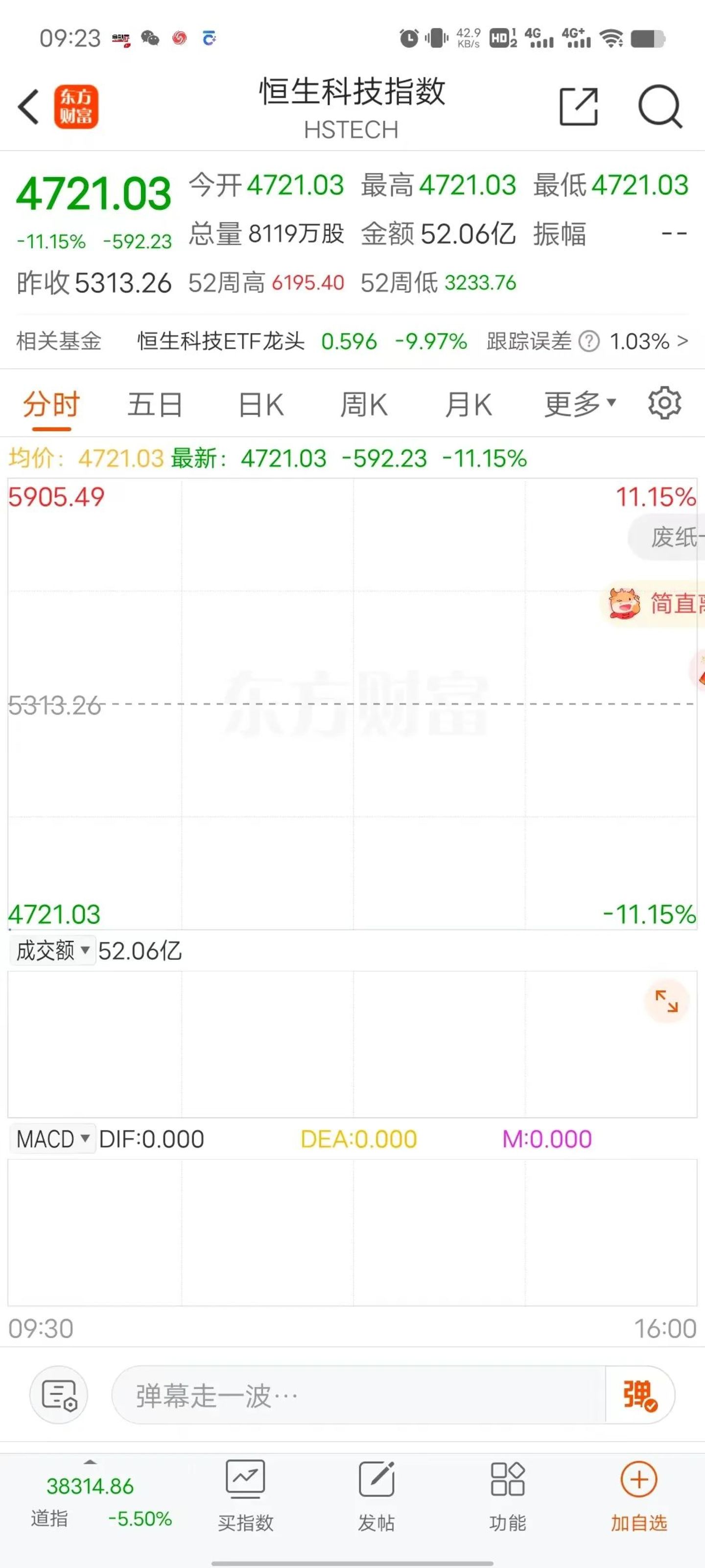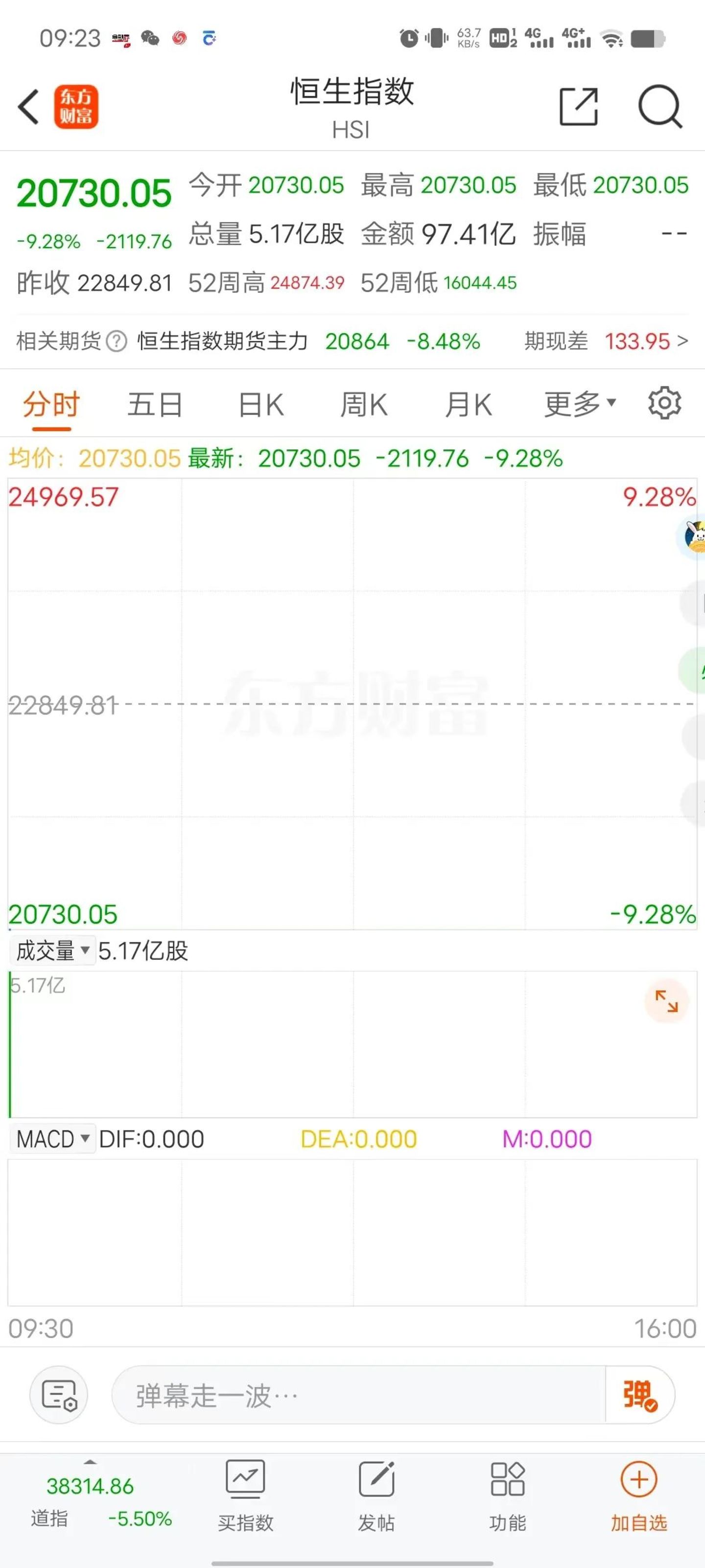 香港恒生指数开盘跌9.28%。恒生科技指数跌11.15%。药明康德、联想集团等个股跌近15%。