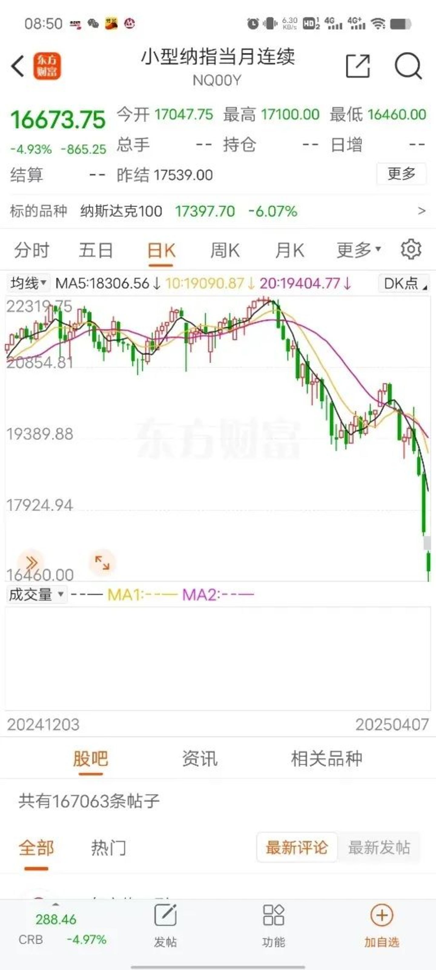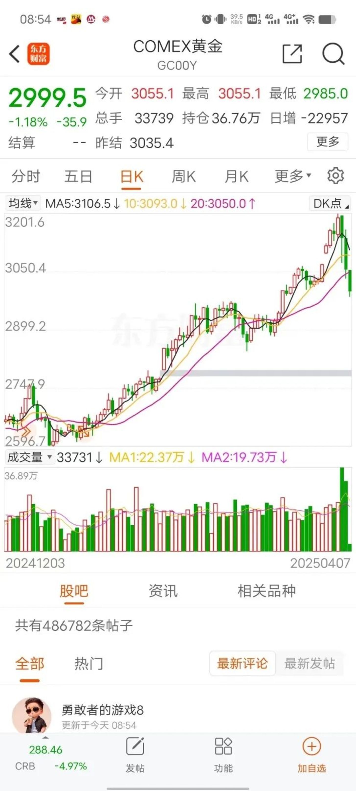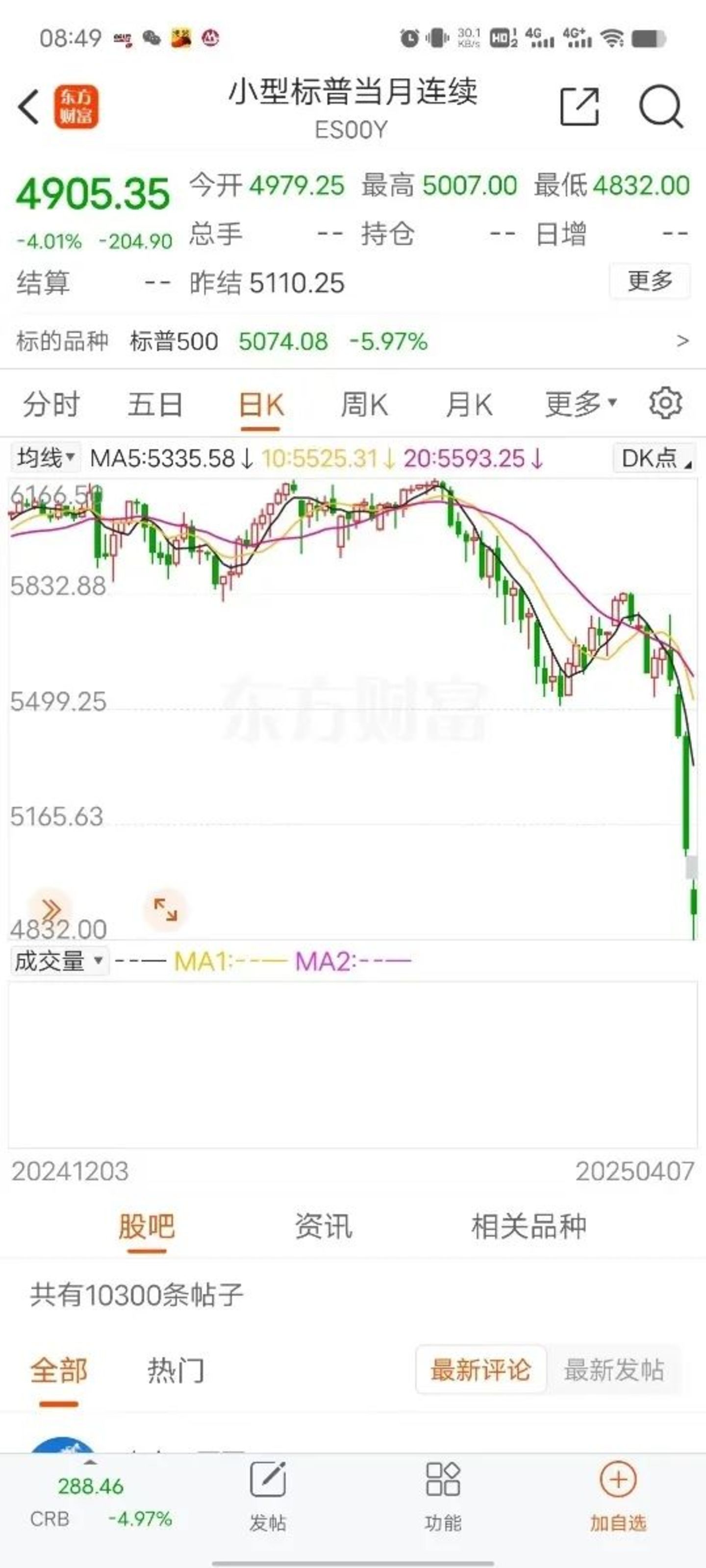 周一美股期货开盘暴跌,标普500股指期货开盘下跌2.6%,随后跌幅迅速扩大至超过4%,纳指期货跌幅一度超过5%。恐慌指数期货暴涨,黄金继续回调,铜油暴跌。