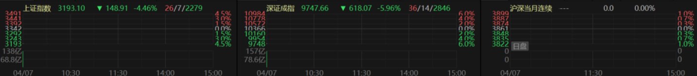 富时中国A50指数期货在上一交易日夜盘收跌2.89%的基础上低开,现跌4.41%,沪指开跌4.46%,深证成指开跌5.96%,创业板指开跌 6.77%,沪深京三市近800股跌超9%。