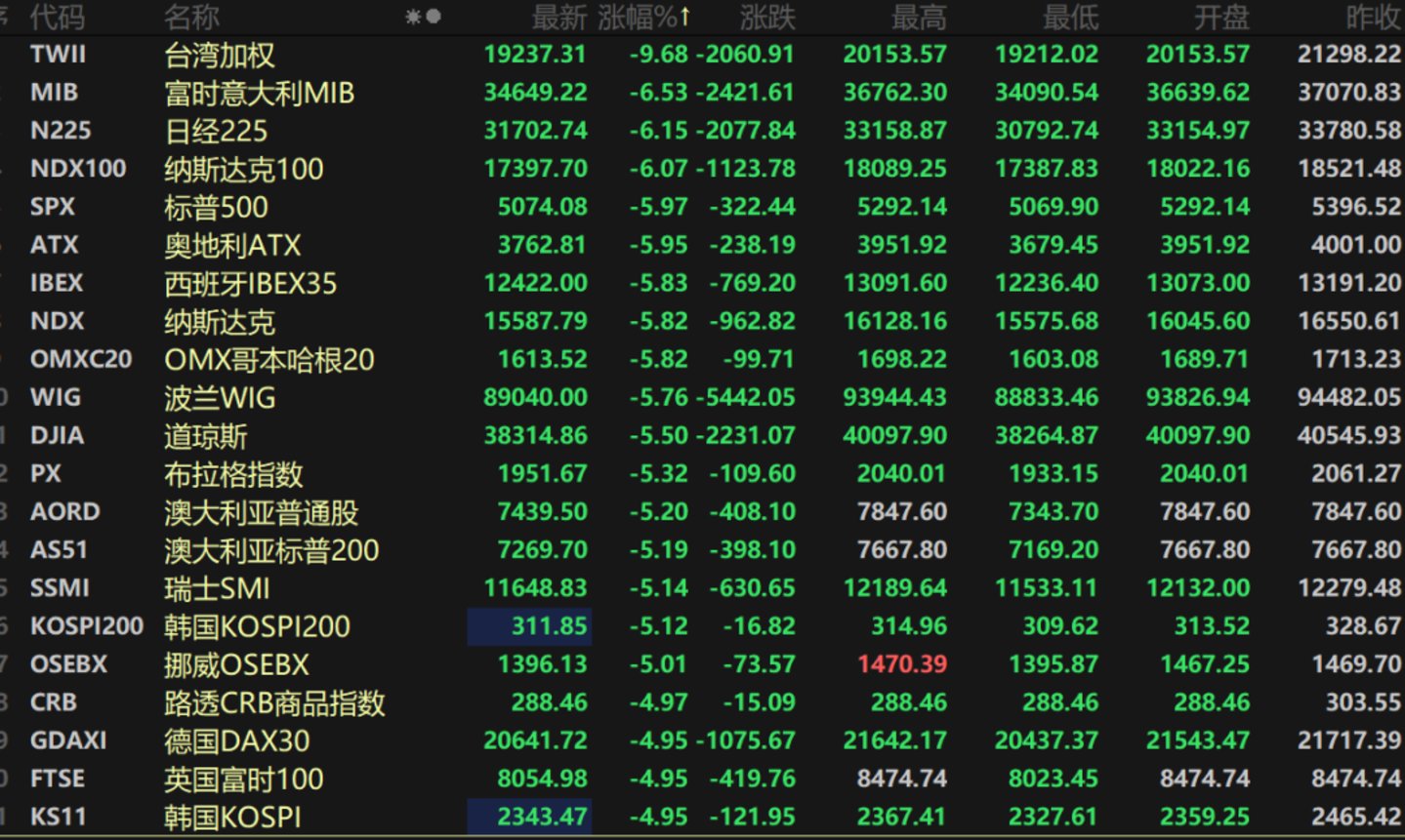 在特朗普宣布对贸易伙伴全面加征关税,以及多国随后出台反制措施后,一场史诗级别的贸易战正式打响了,全球金融市场迎来了一场“浩劫”,投资者几乎无处可逃,而这可能仅仅是个开始。