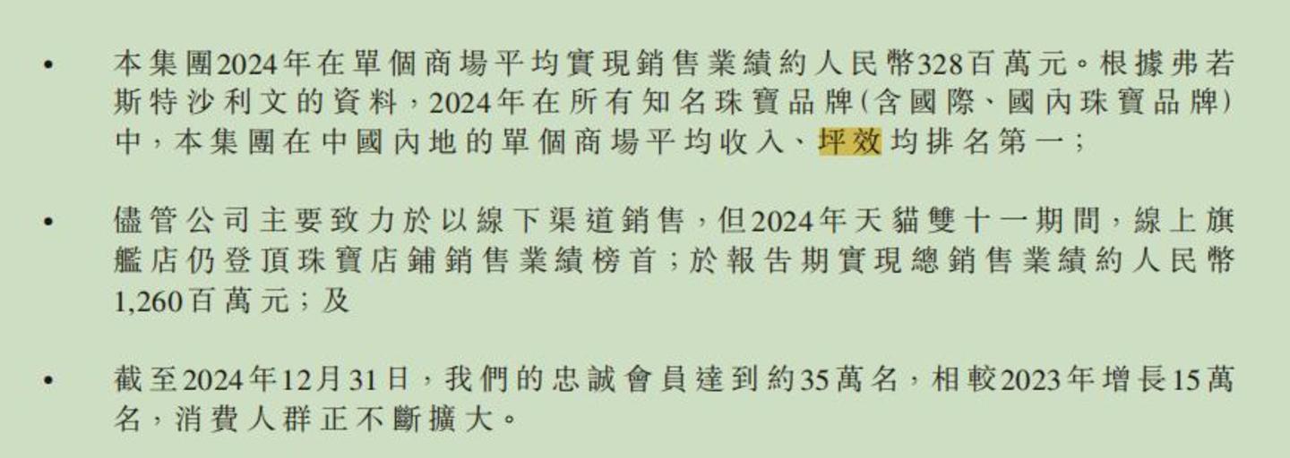 年报显示,2024年老铺黄金在单个商场的平均销售业绩约为3.28亿元;根据弗若斯特沙利文统计,老铺黄金在所有国内外知名珠宝品牌当中,在中国大陆的单个商场平均收入、坪效均为第一。