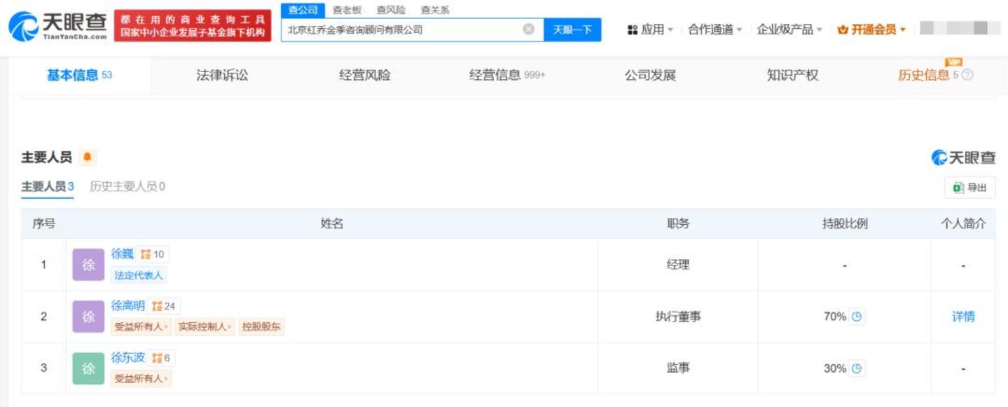 据“天眼查”数据显示,北京红乔金季和天津金橙均为徐高明父子持有。而另一自然人股东陈国栋,其共持有老铺黄金9.14%的股份;据媒体报道,其于1994年加入联想,曾任融科智地控股有限公司董事及深圳市联想科技园有限公司董事兼总经理,上述两家公司均为联想控股(3396.HK)的附属公司。