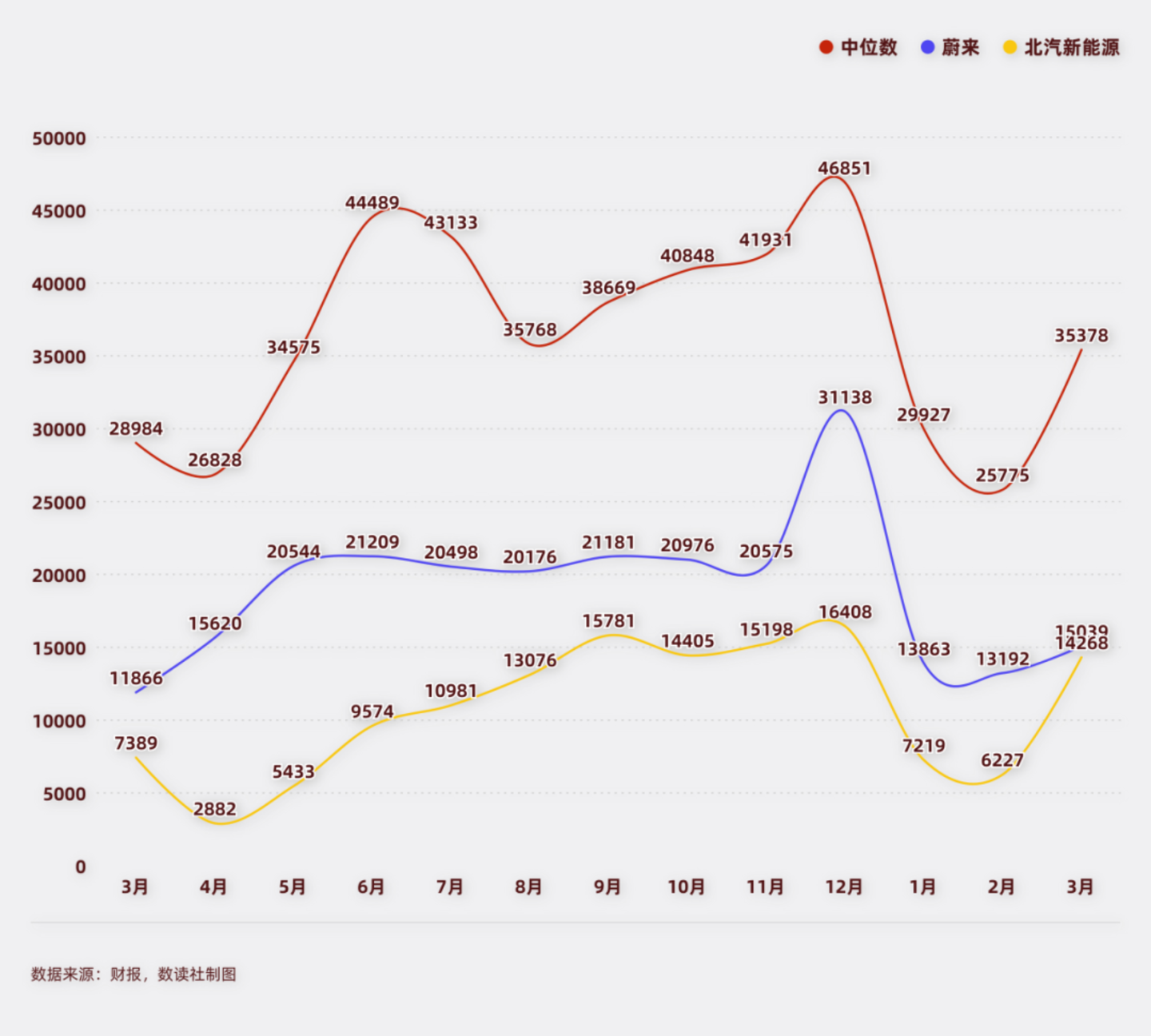 由于比亚迪销量太高,会拉高平均数,因此,中位数更能代表上岸的门槛。如果长期低于中位数,并且偏离值过高,那么其面临的淘汰压力会非常大。目前来看,北汽和蔚来的压力可能是最大的。