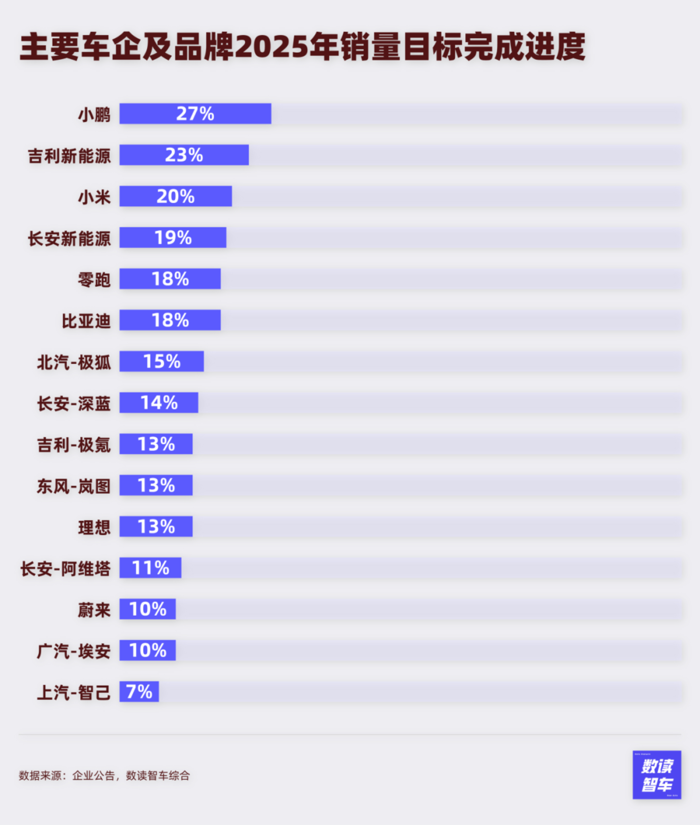 一季度的销量通常不会太亮眼,因此,多数车企的进度都会滞后。小鹏是表现最亮眼的车企,三个月完成了目标的27%,进度非常乐观。